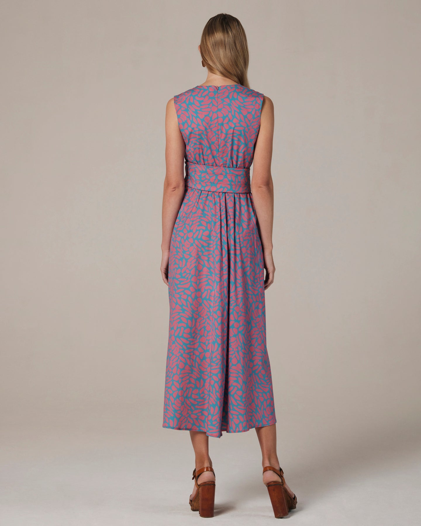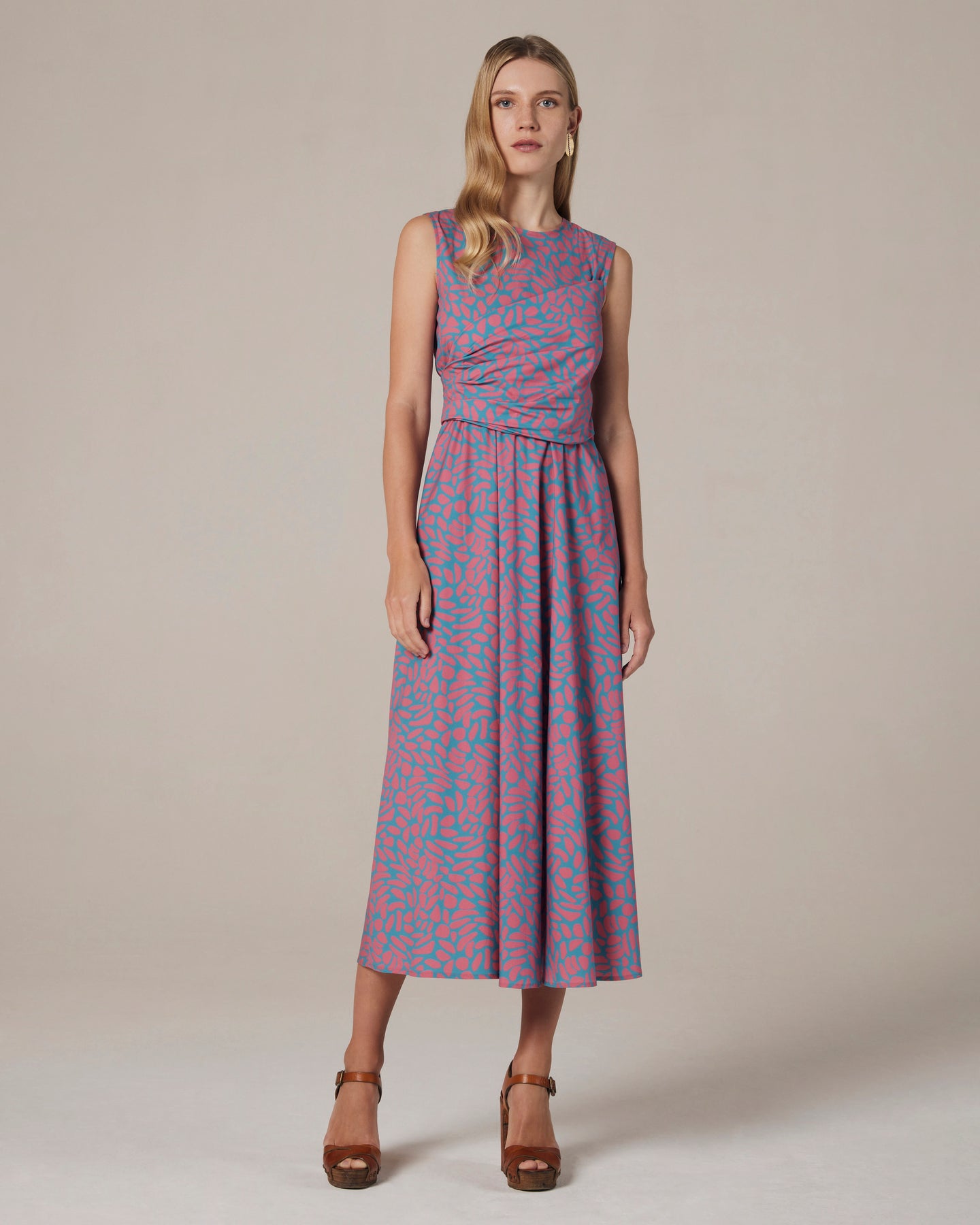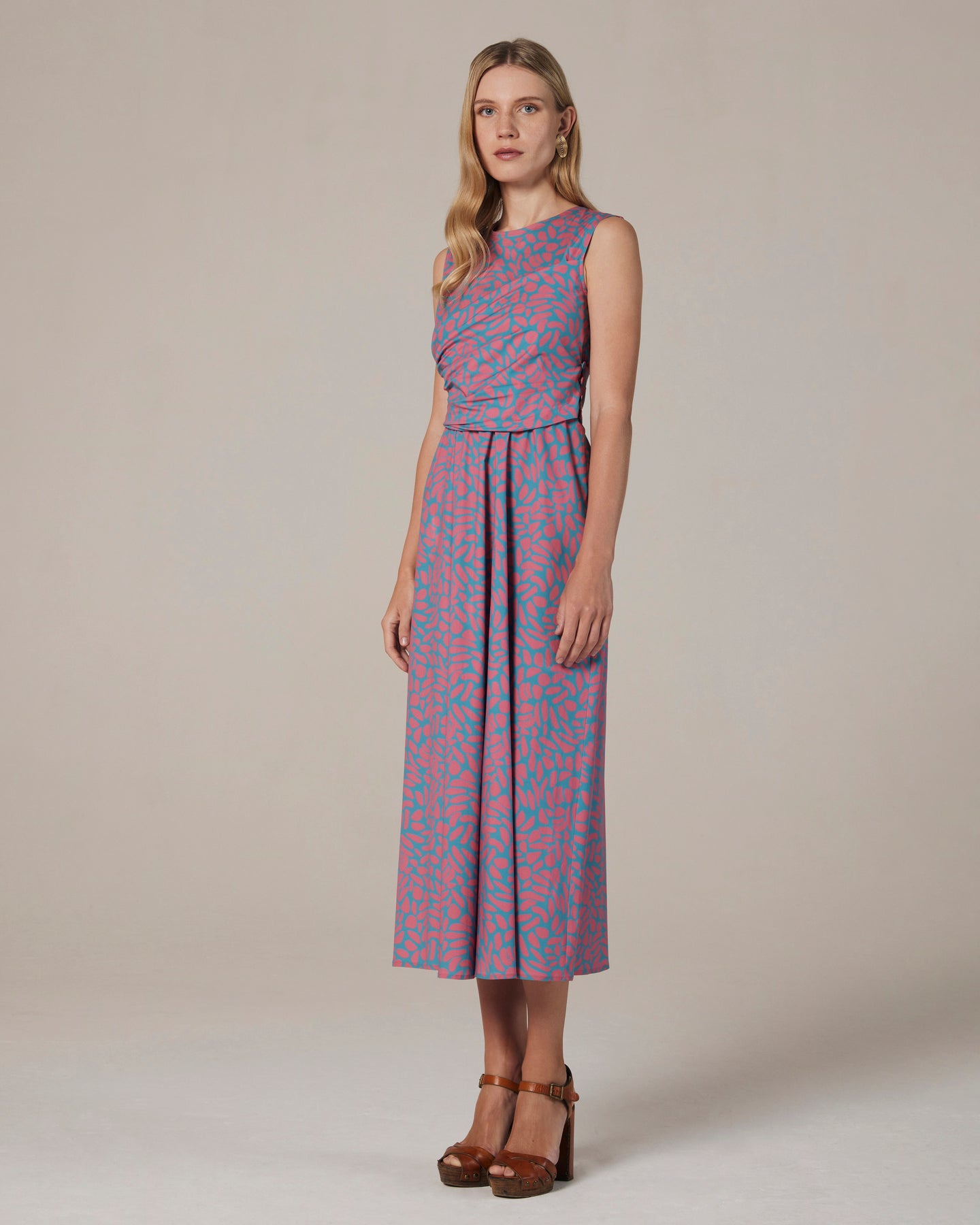 Abito in fresco popeline stampato, con drappeggio sul corpino e gonna morbida. Longuette, perfetto per le giornate estive.
