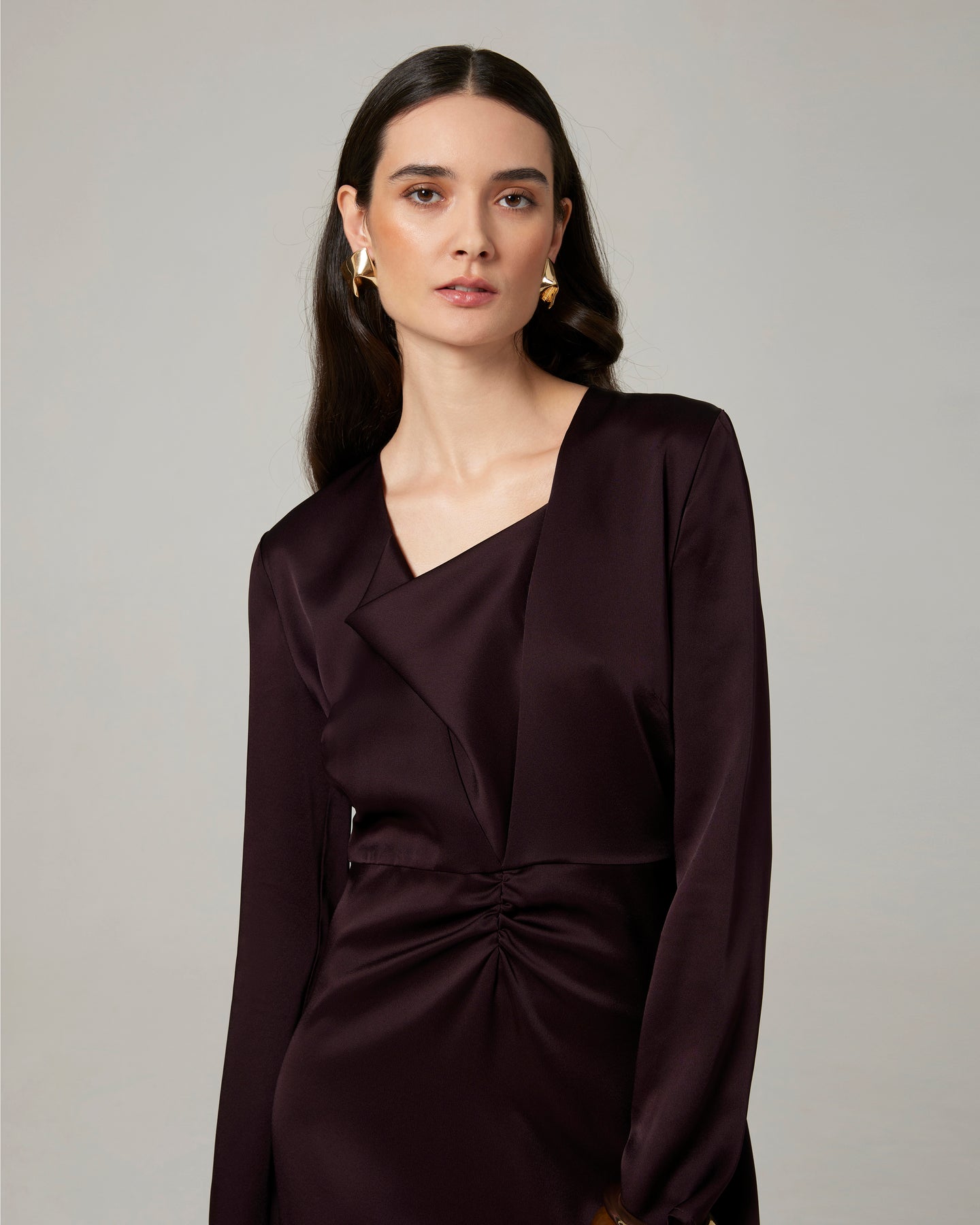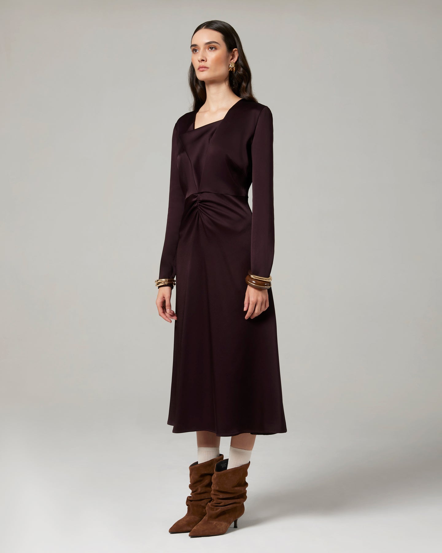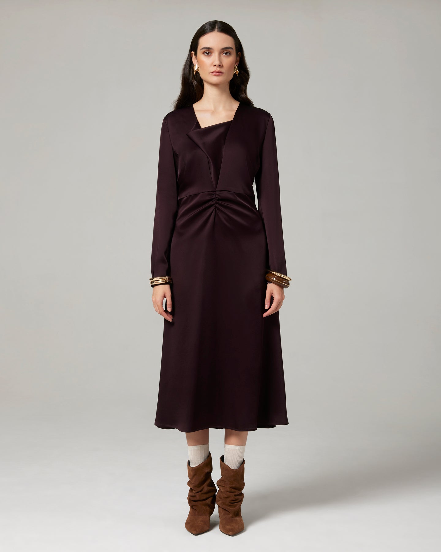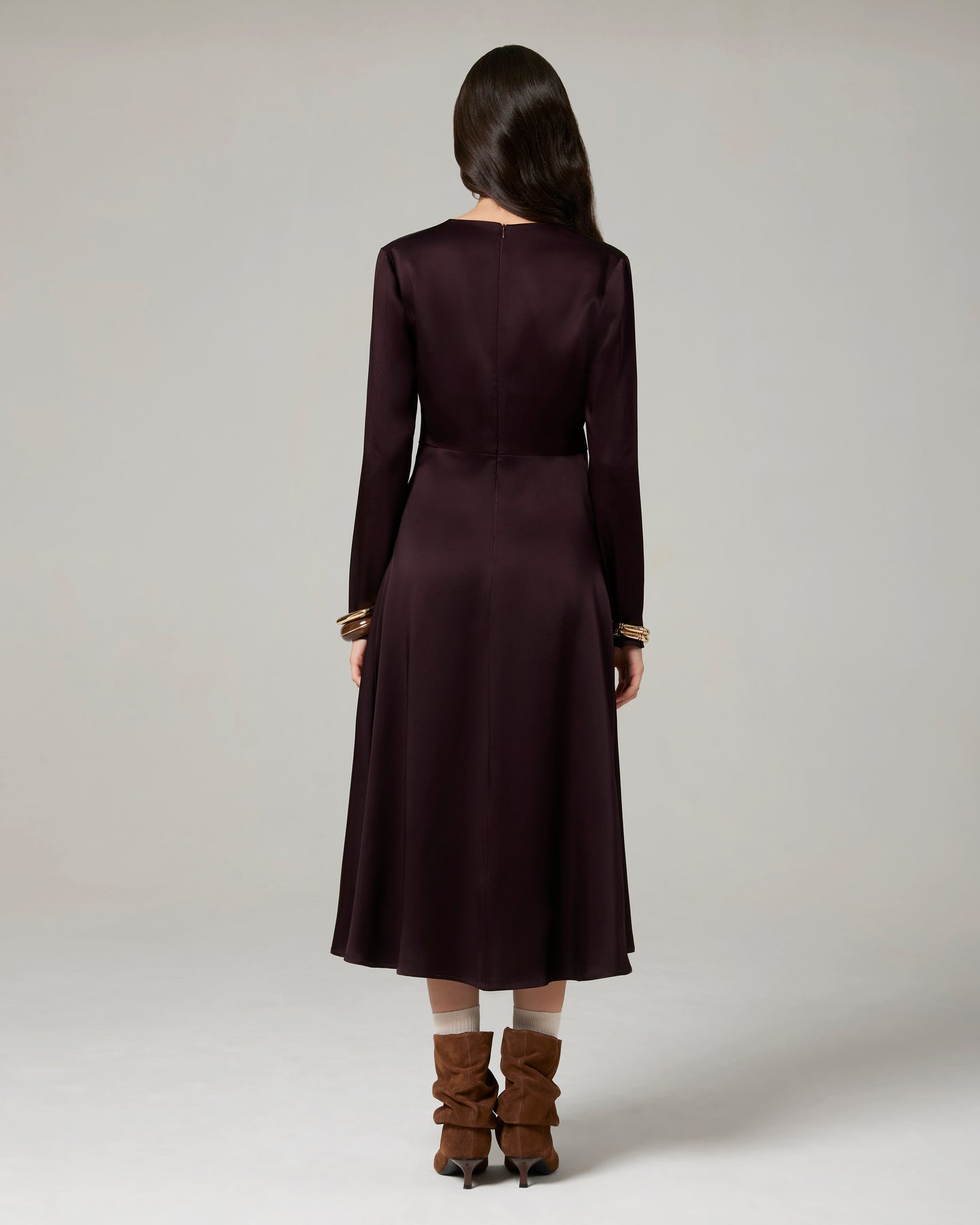 Abito in cady con drappeggio appena sotto la vita e corpino con profondo scollo a V riempito da un tassello nello stesso tessuto che crea movimento. Gonna morbida. La versione mosto è in cady lucido.