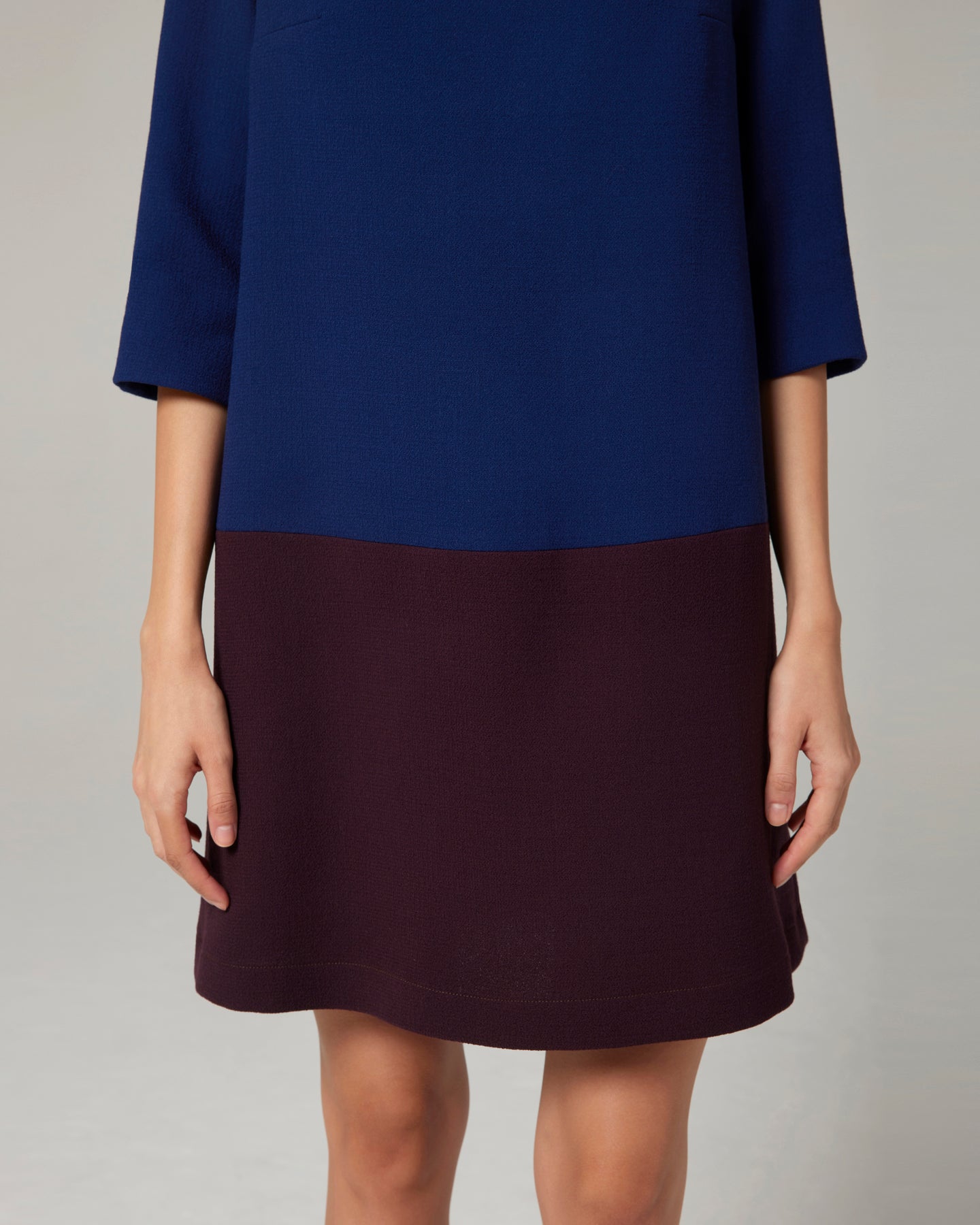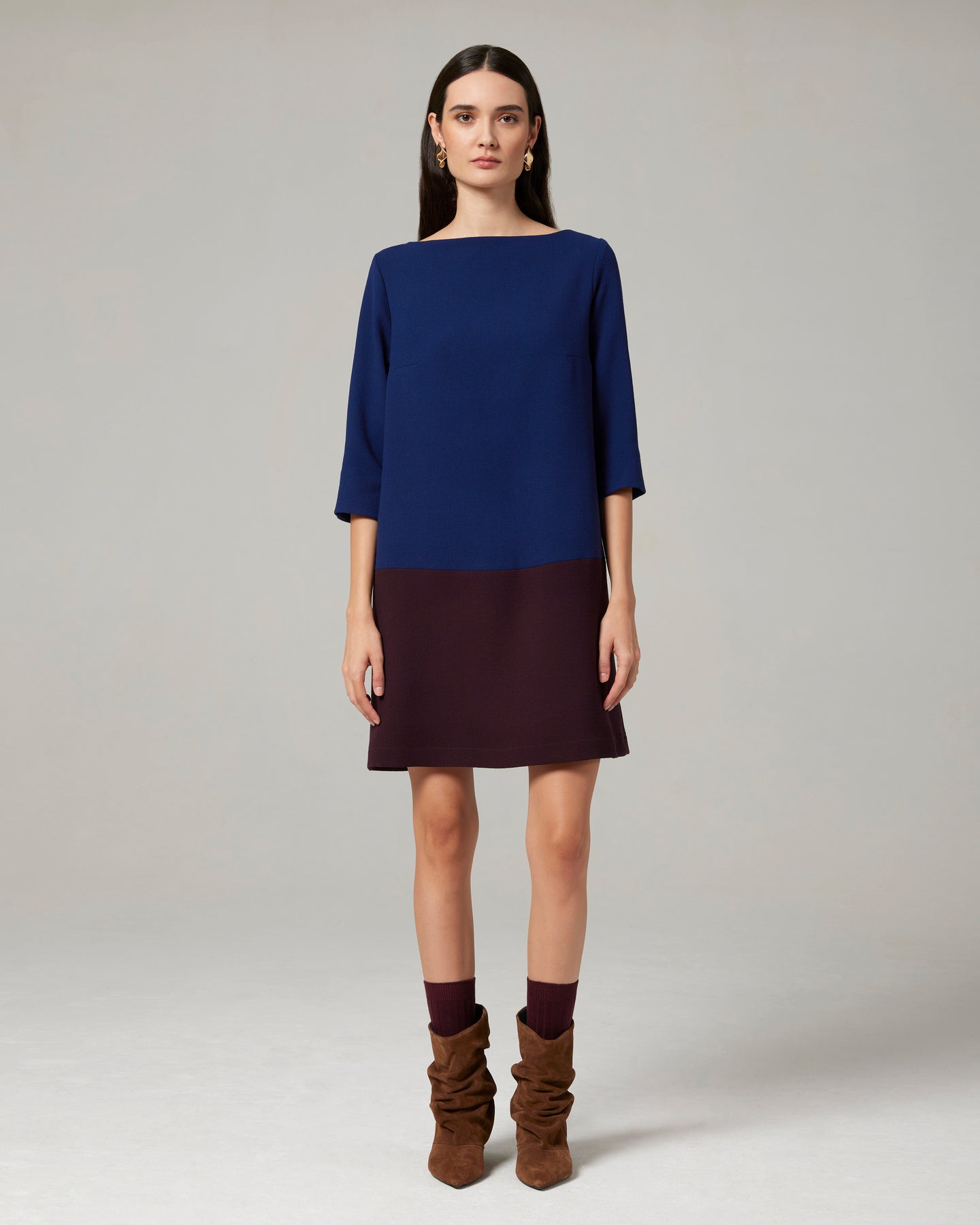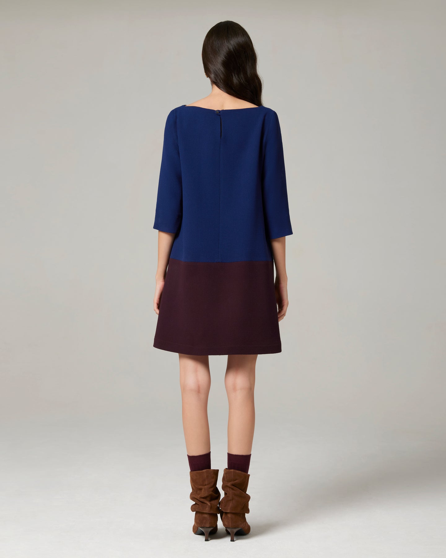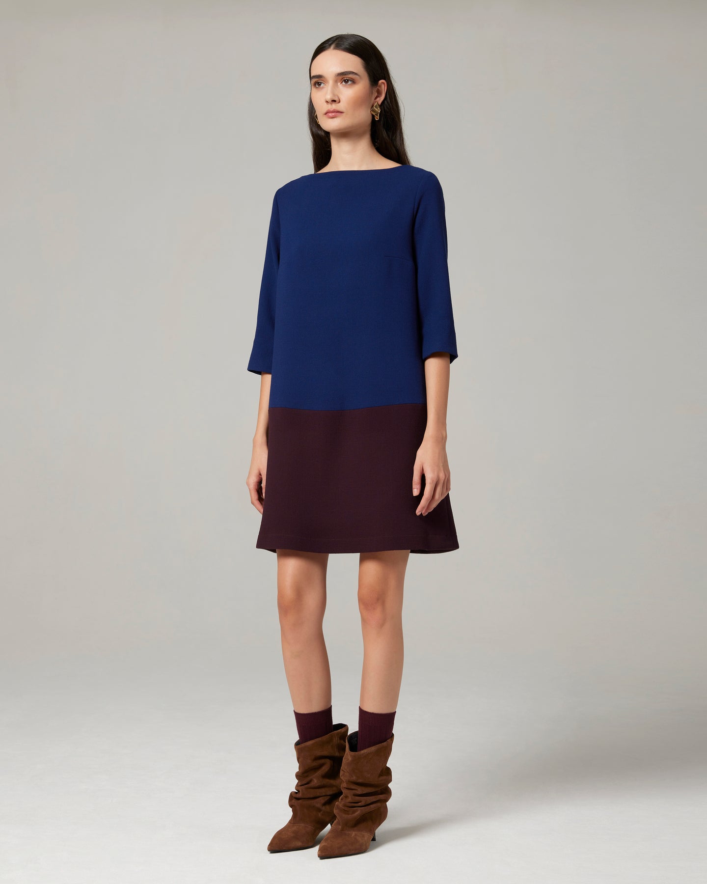 Abito a trapezio bicolore in doppio crepe di pura lana.