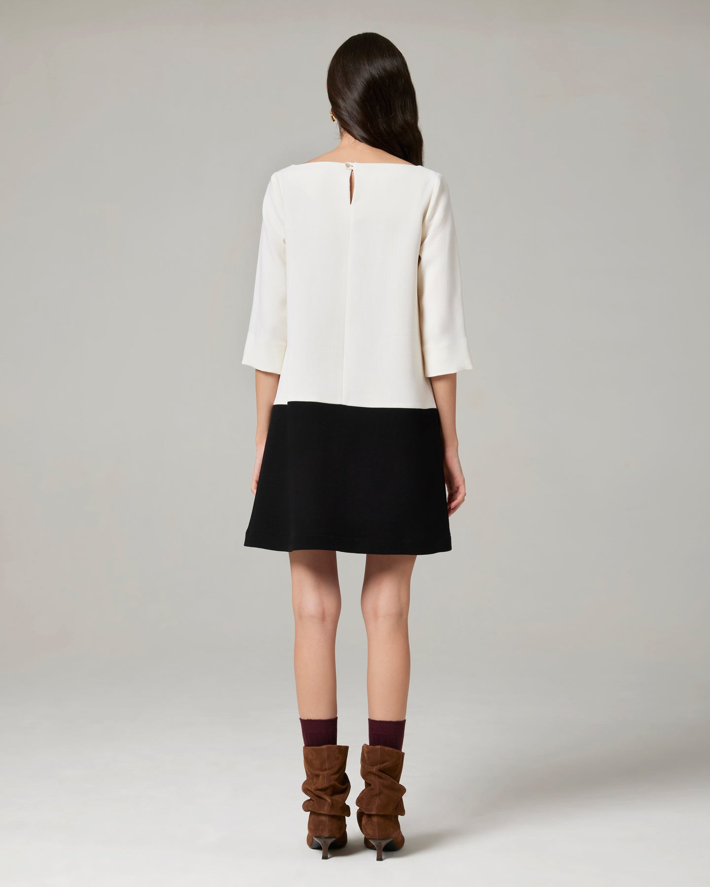 Abito a trapezio bicolore in doppio crepe di pura lana.