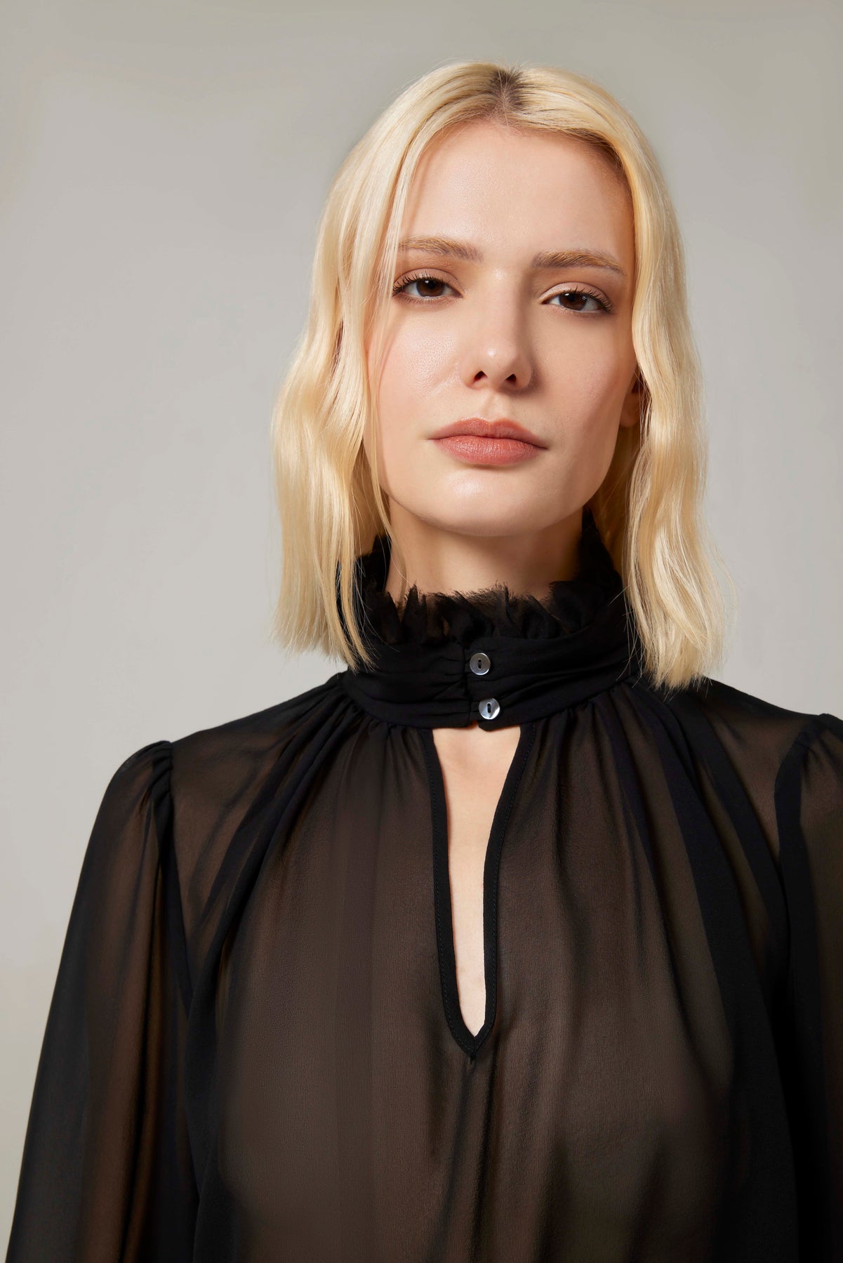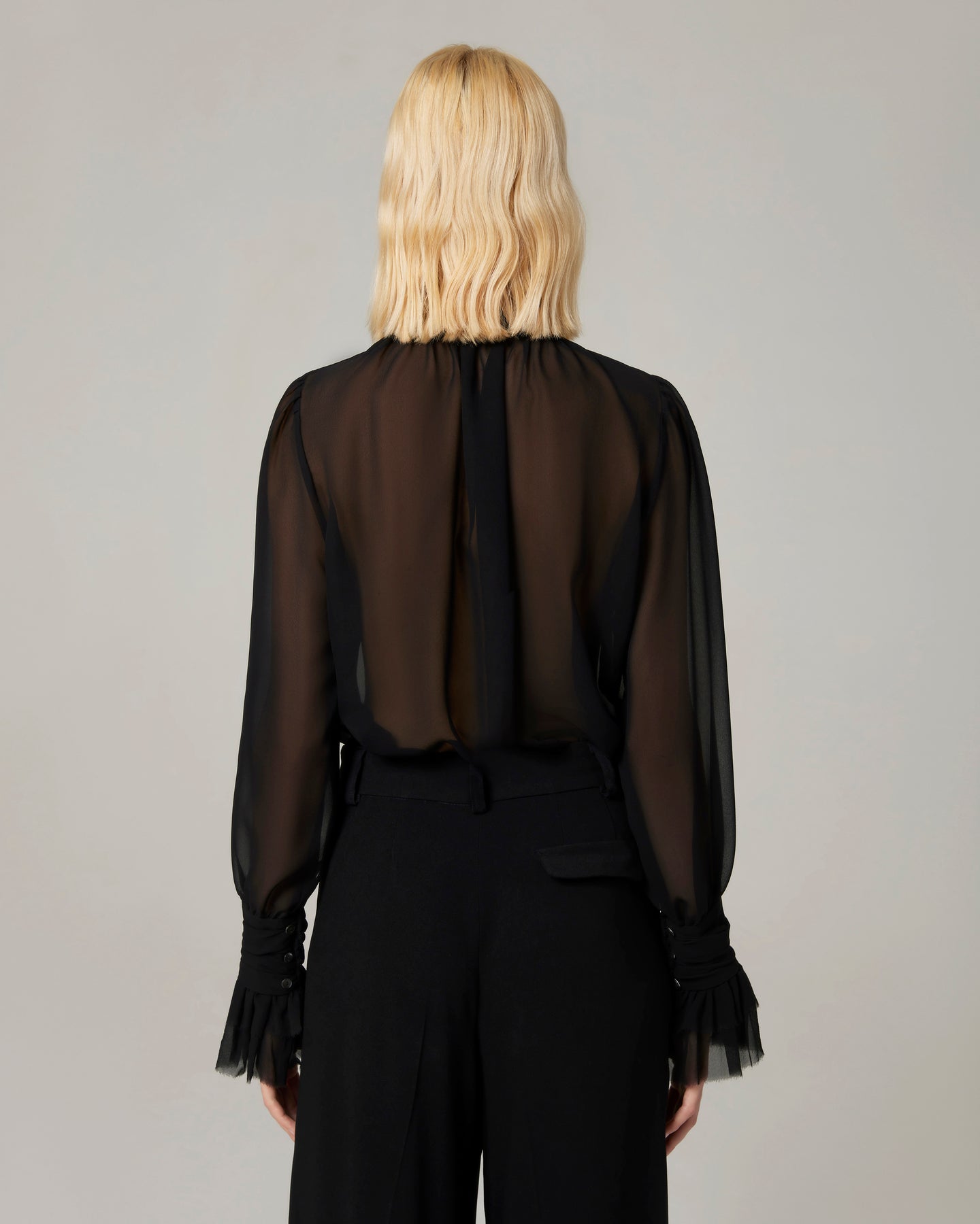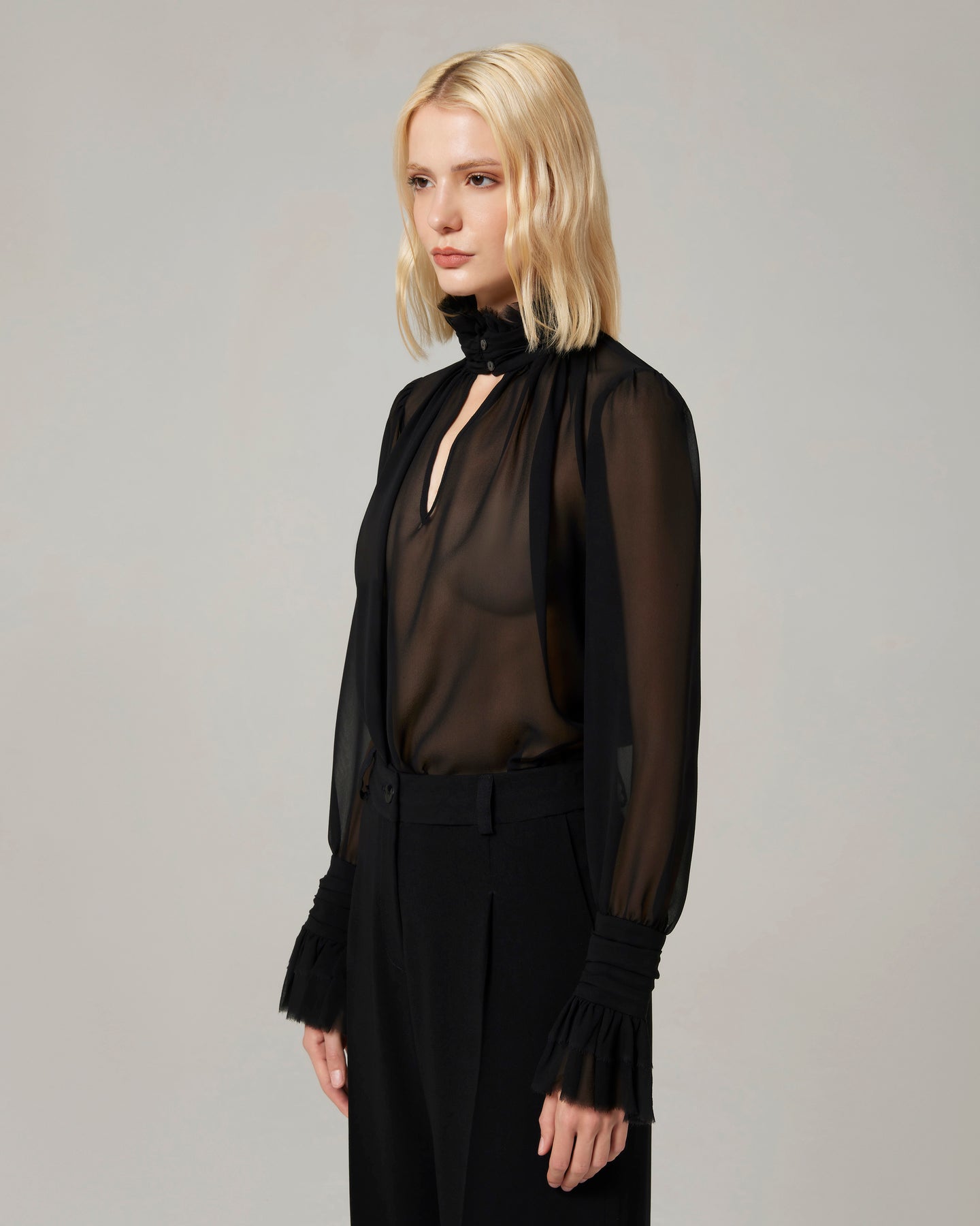 Romantica e superfemminile blusa in georgette di seta, con alto collo e polsini arricchiti da rouches tagliate al vivo. Profondo scollo a V.