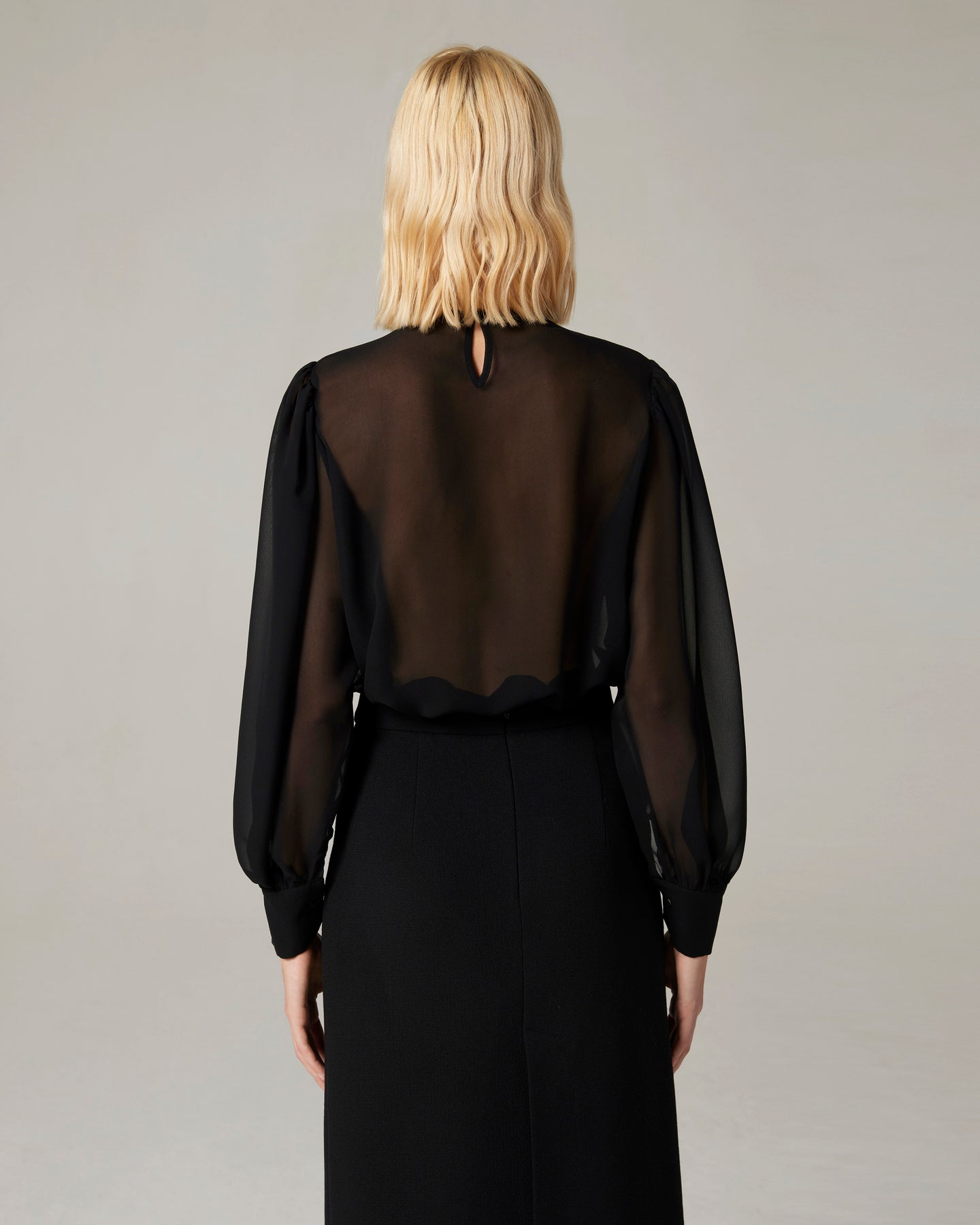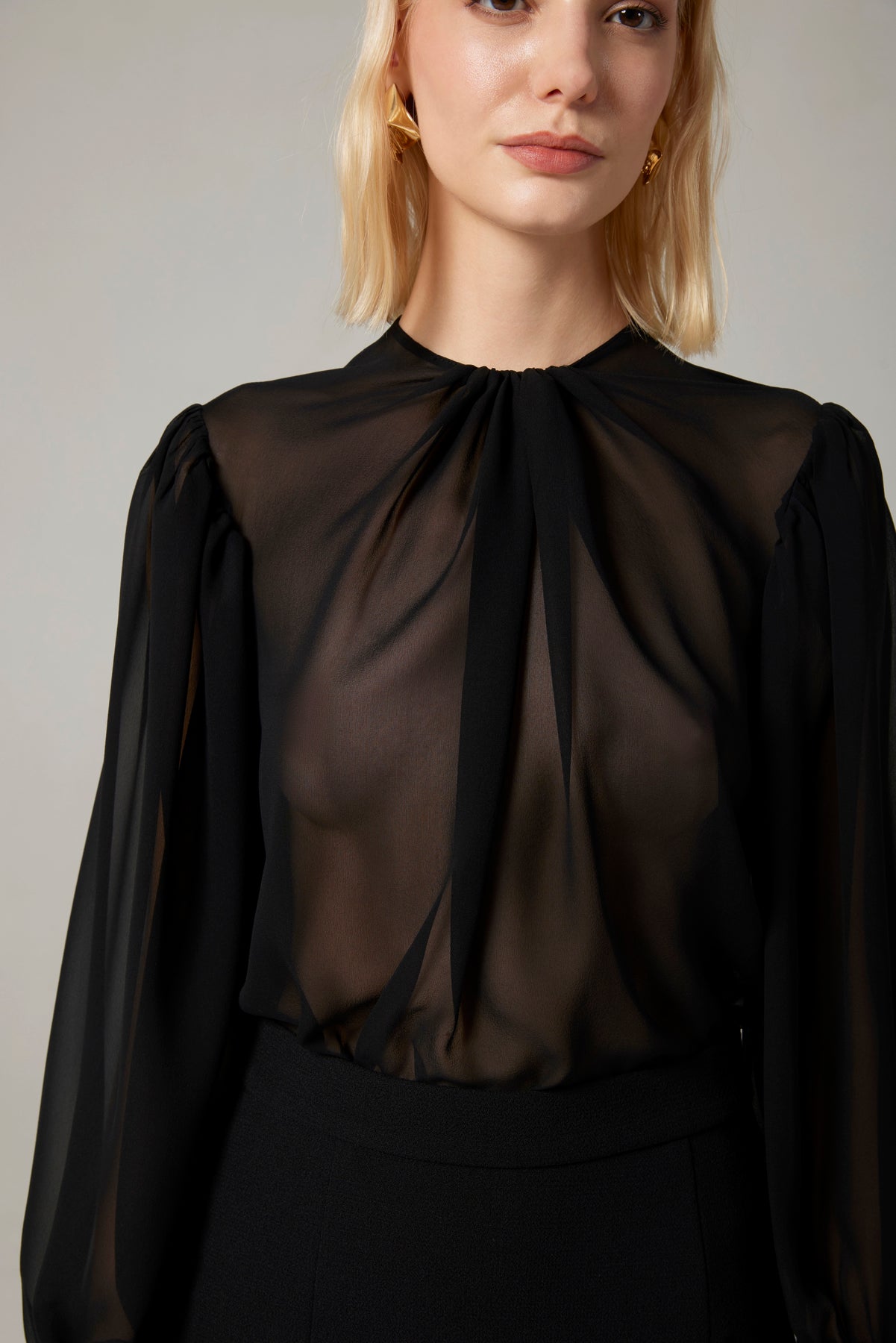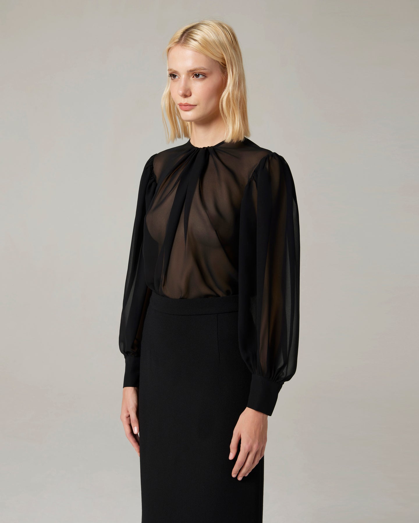 Blusa girocollo in georgette di pura seta. Maniche ampie e leggermente arricciate, raccolte al fondo in un polsino alto. Arricciatura centrale su davanti che crea ricchezza e morbidezza..