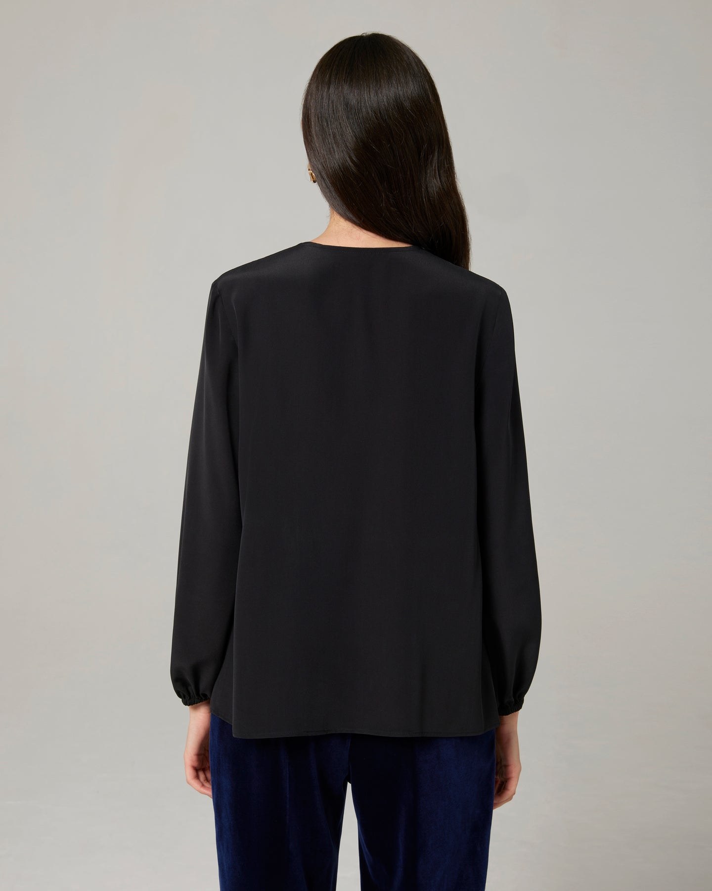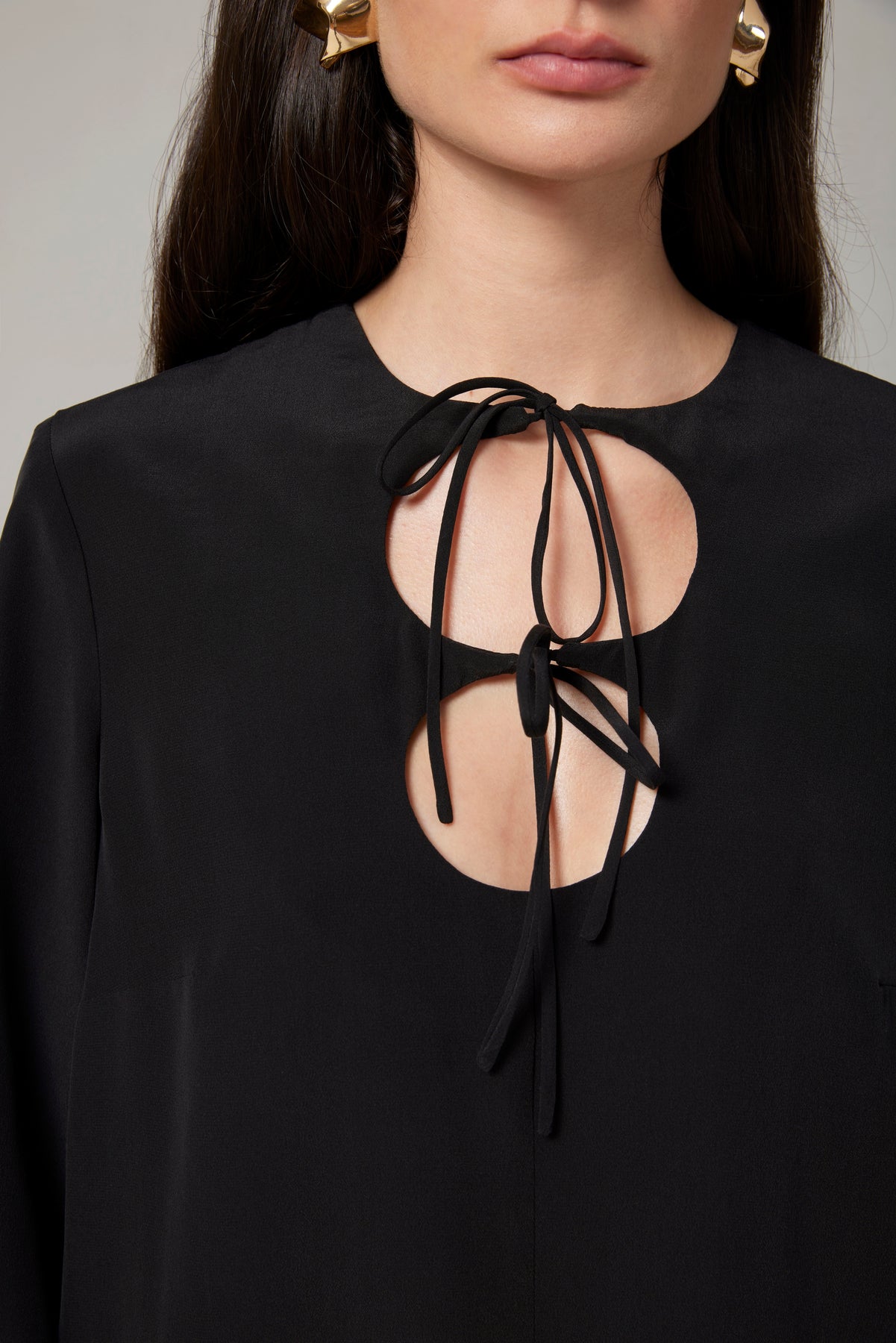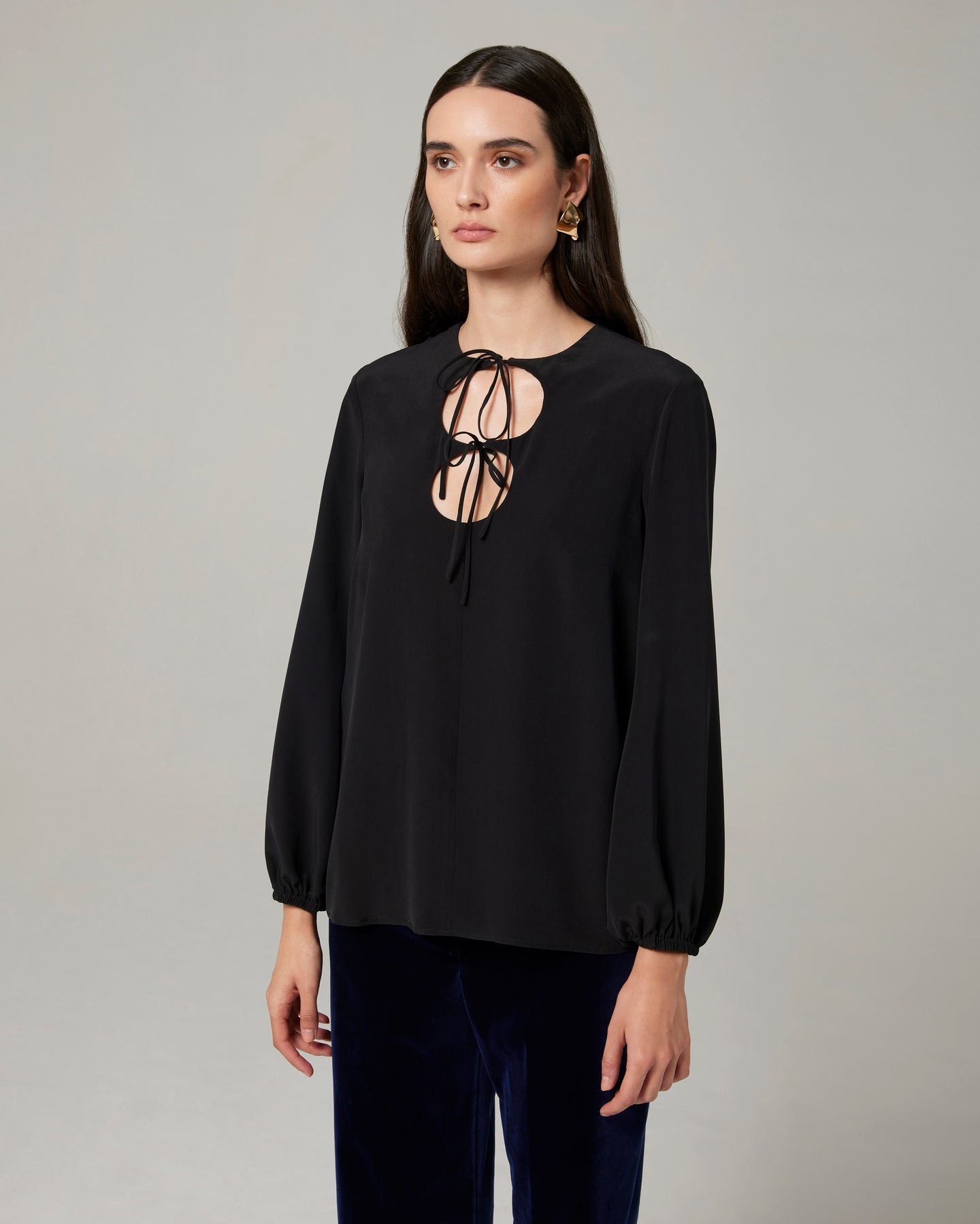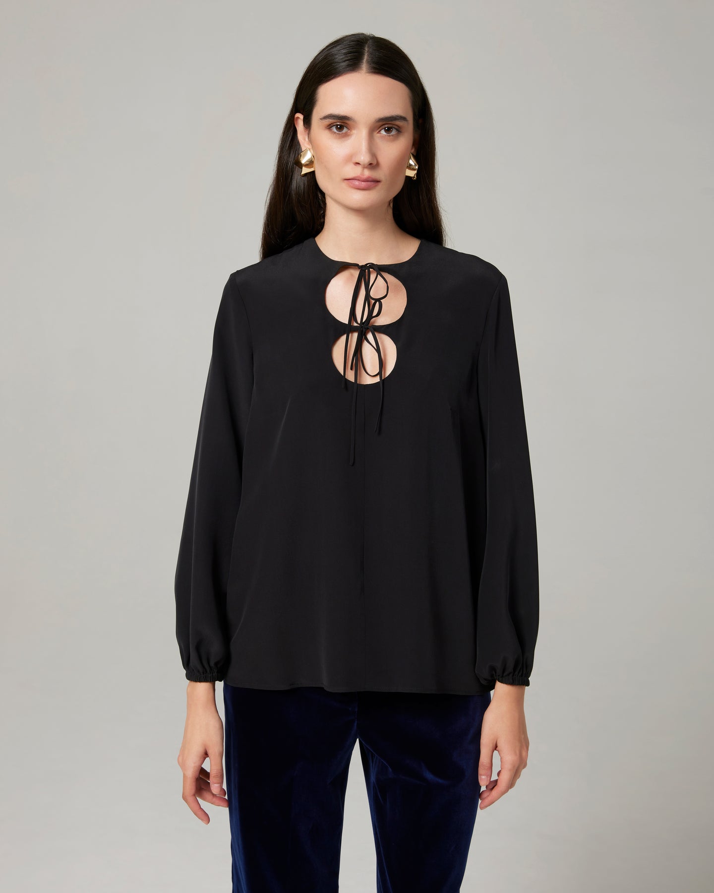 Particolare e donante blusa in seta con scollo formato da due oblò che si allacciano sul davanti con fiocchetti.