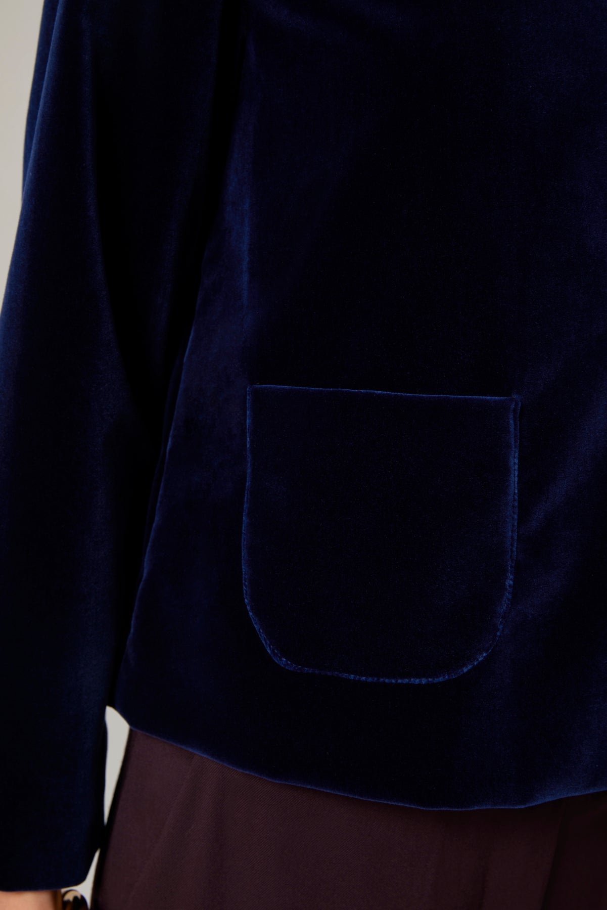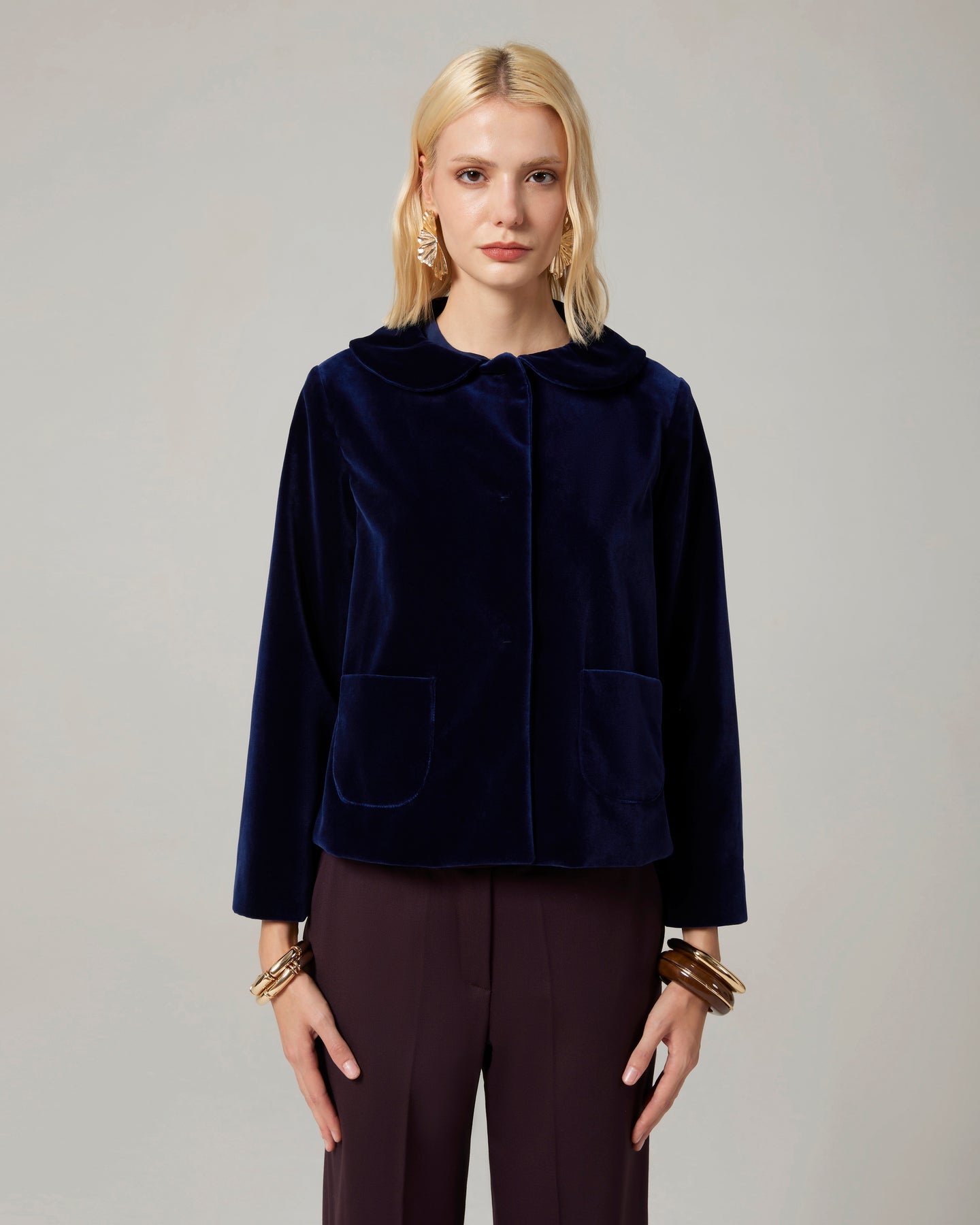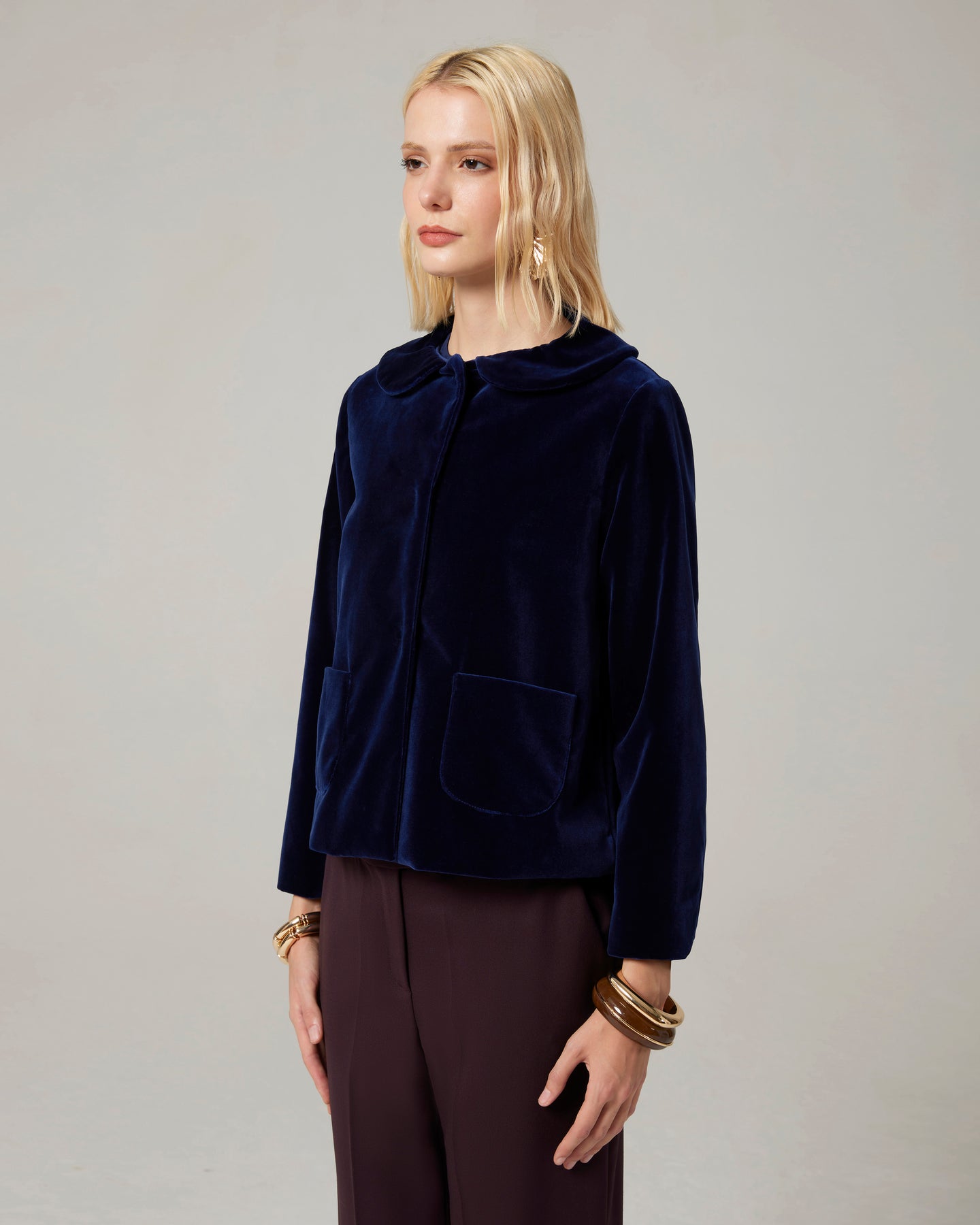 Giacchina in velluto con collo rotondo e tasche applicate. Forma a sacchetto, chiusura con automatici.