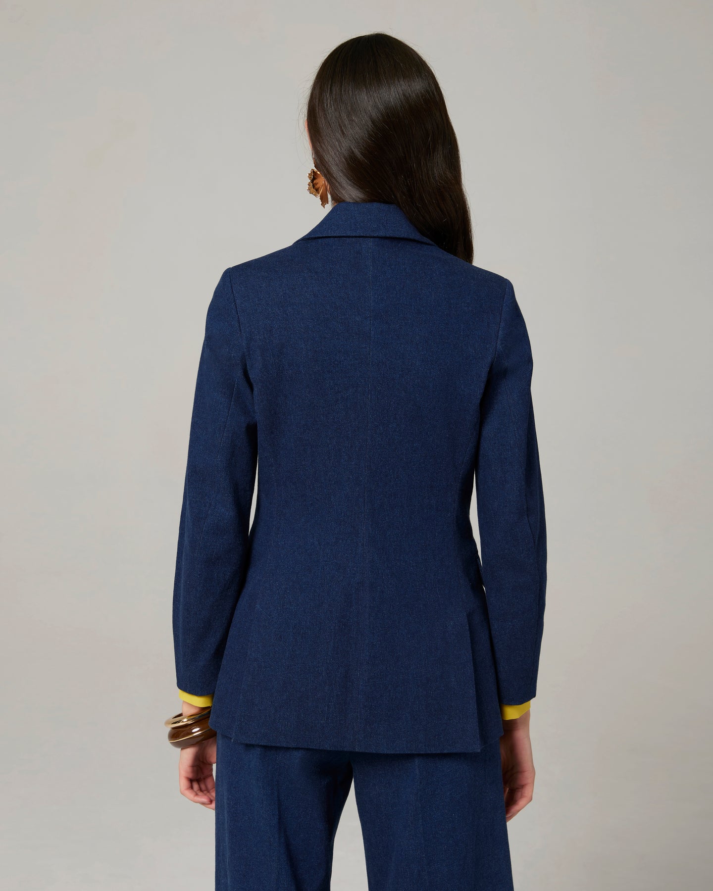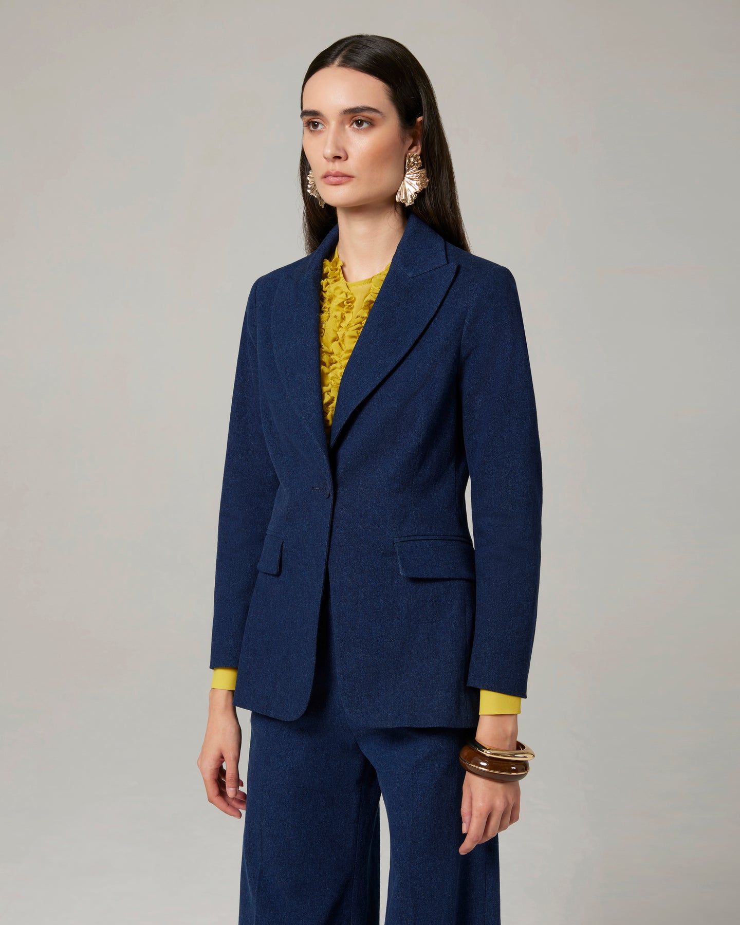 Giacca monopetto con ampio revere dalle proporzioni perfette. Accostata in vita, spacchi posteriori. Qui nella versione in denim.