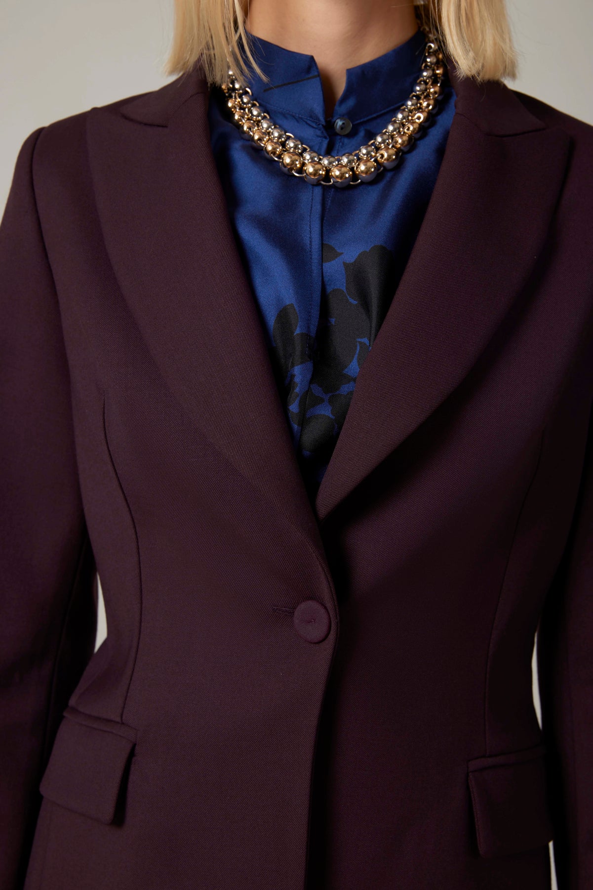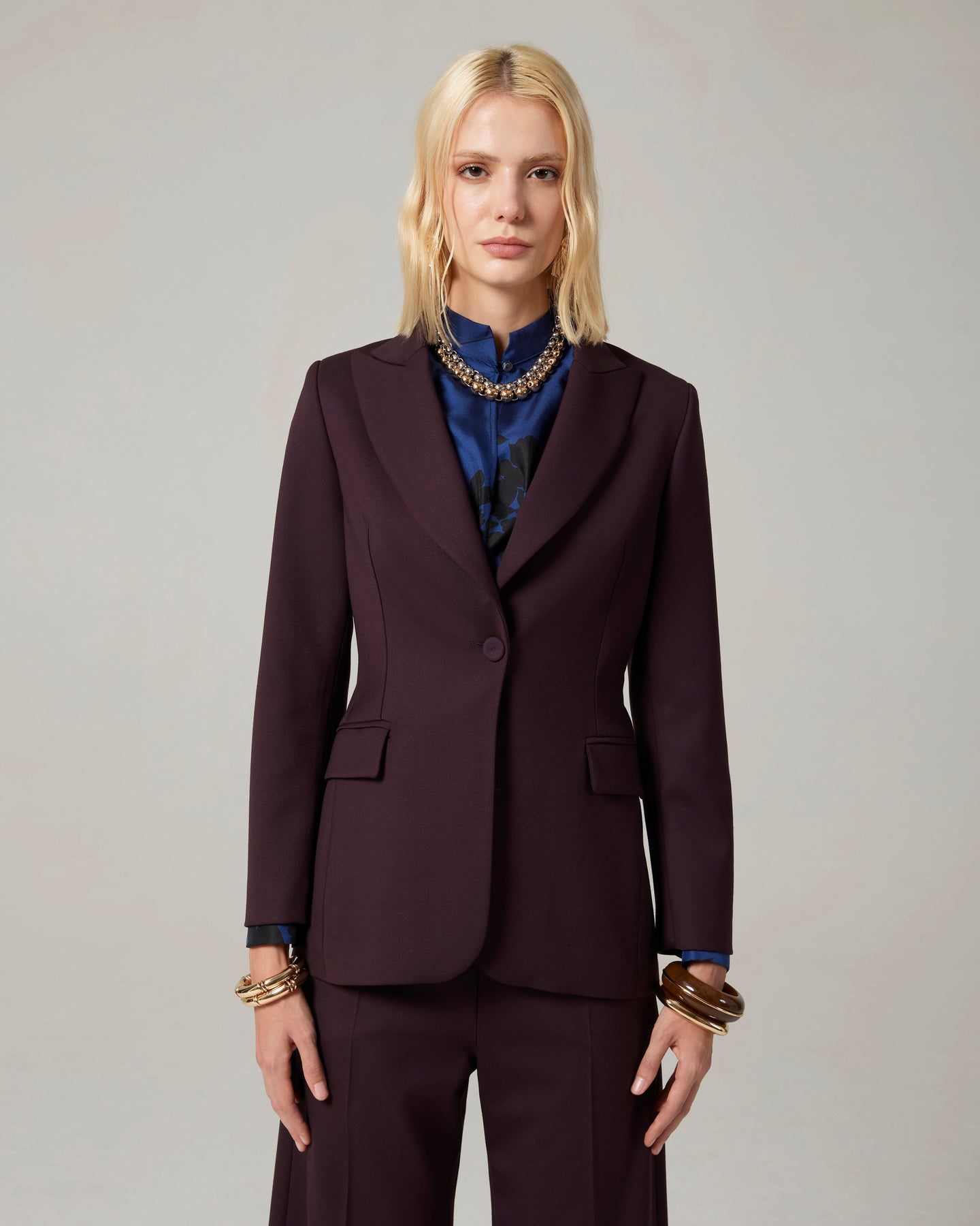 Giacca monopetto in saglia di lana elasticizzata con ampio revere dalle proporzioni perfette. Accostata in vita, spacchi posteriori. Disponibile anche in nero.