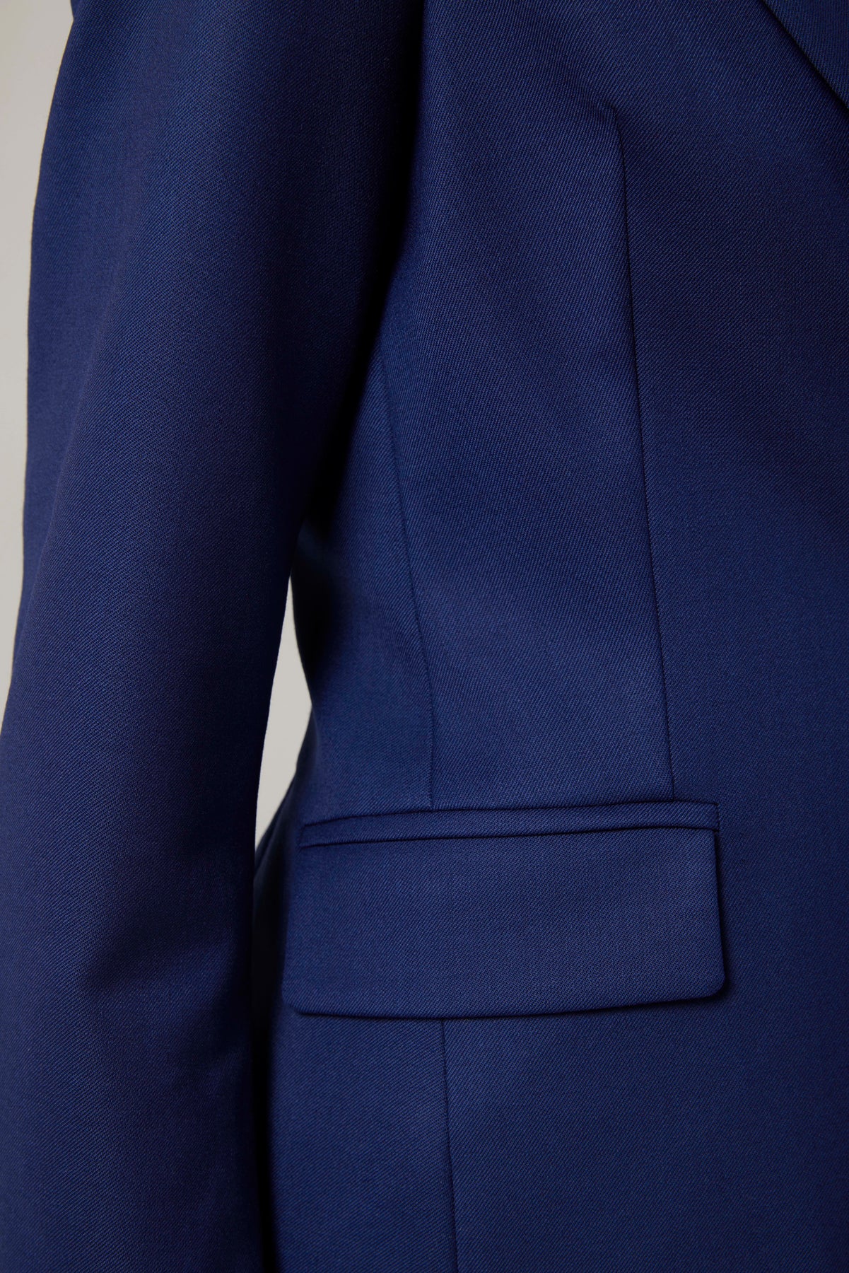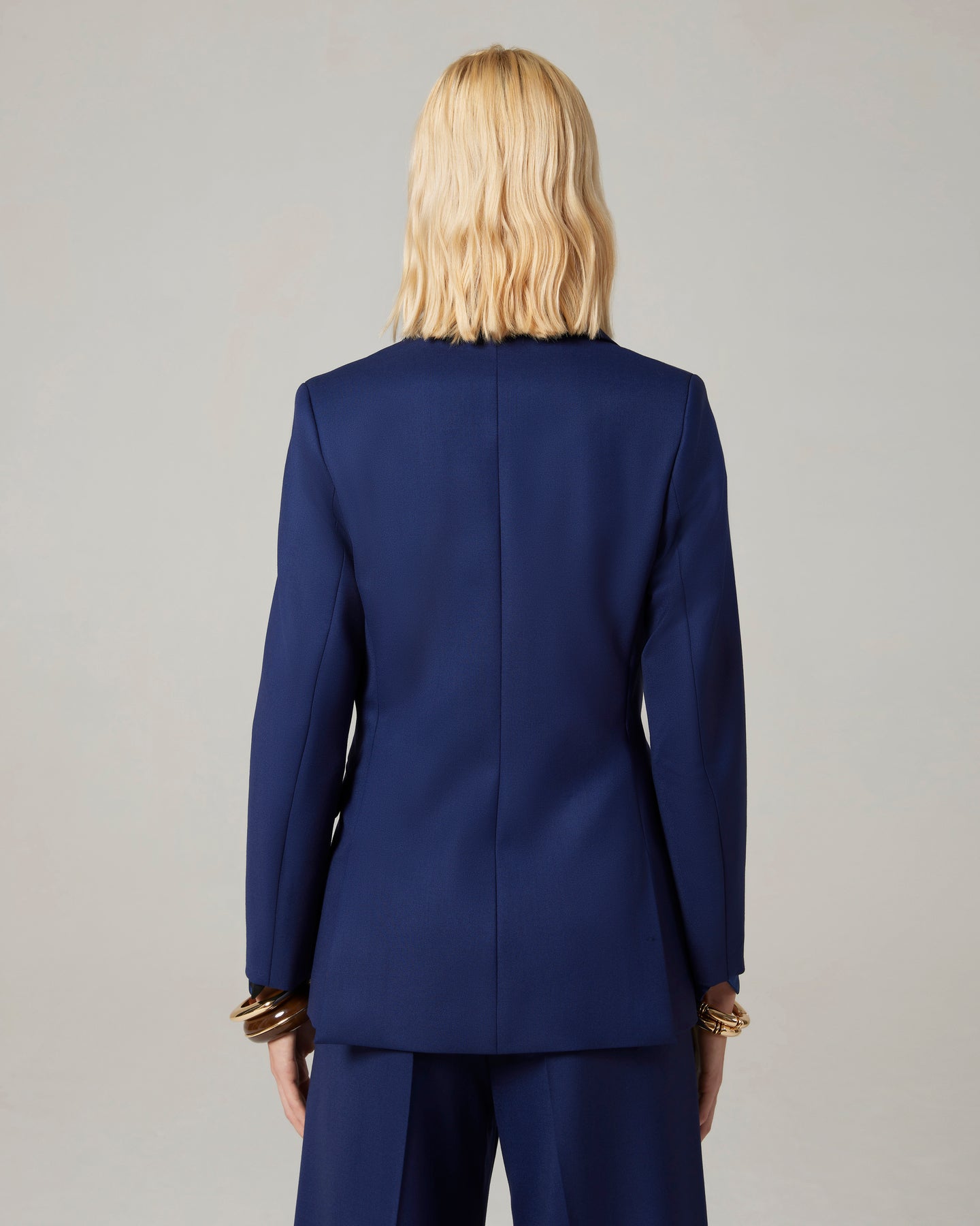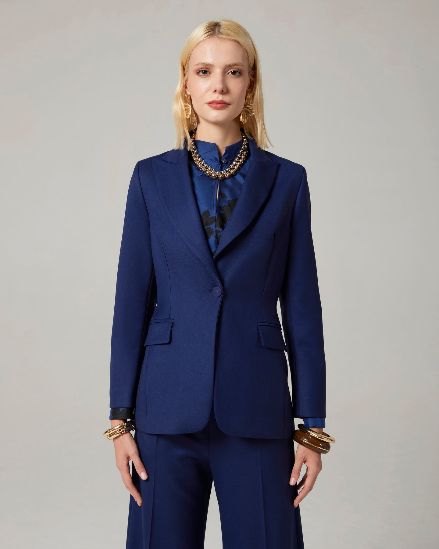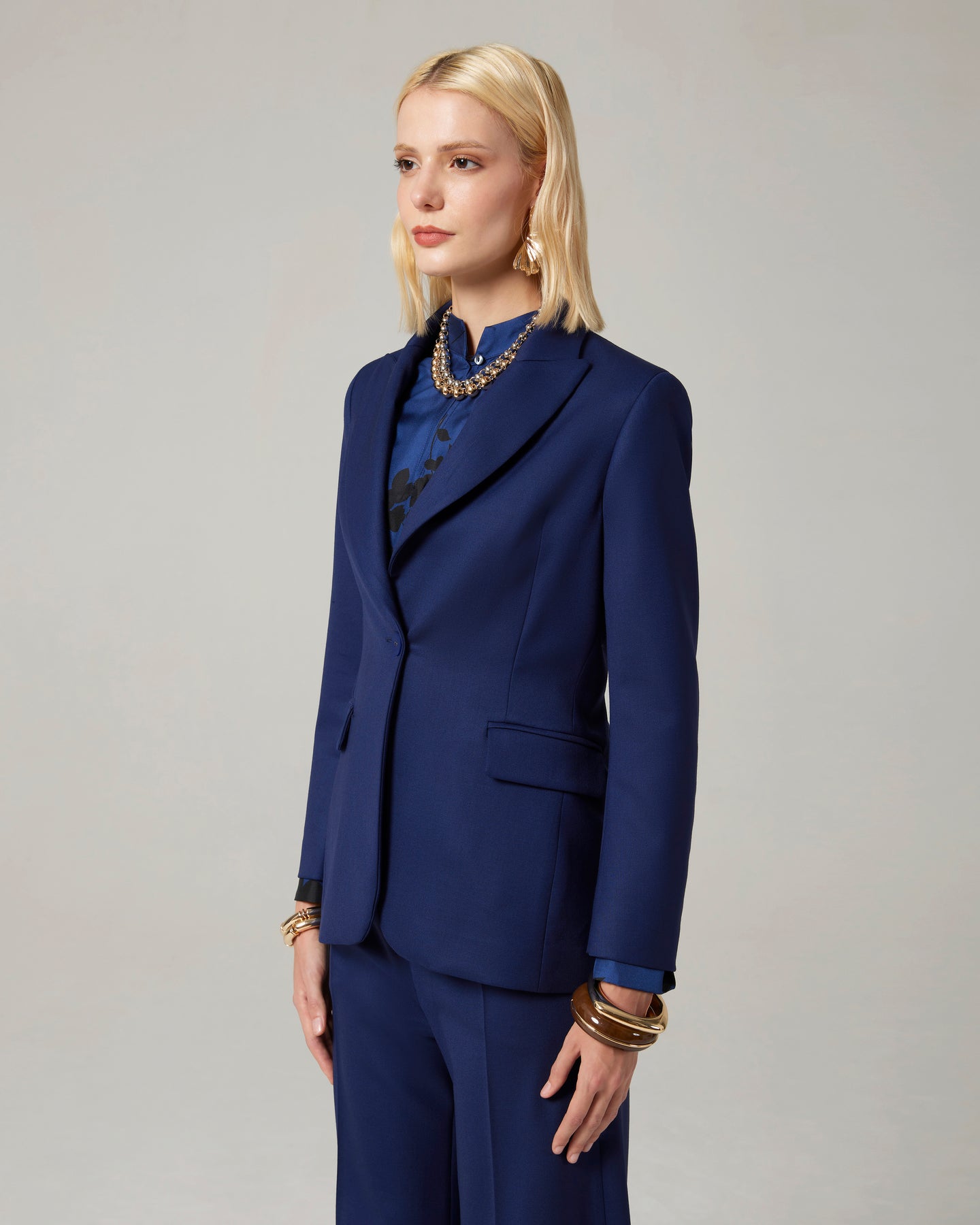 Giacca monopetto in saglia di lana elasticizzata con ampio revere dalle proporzioni perfette. Accostata in vita, spacchi posteriori. Disponibile anche in nero.