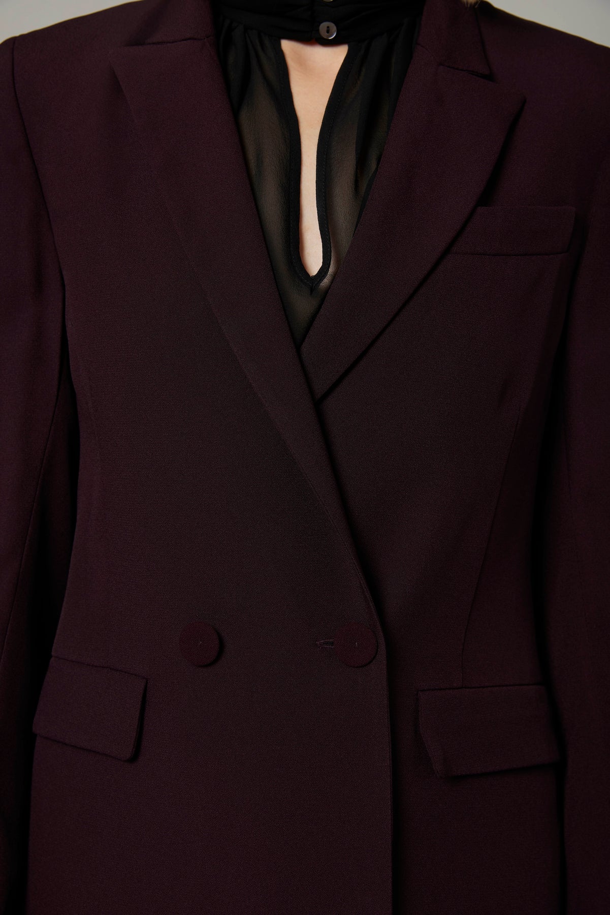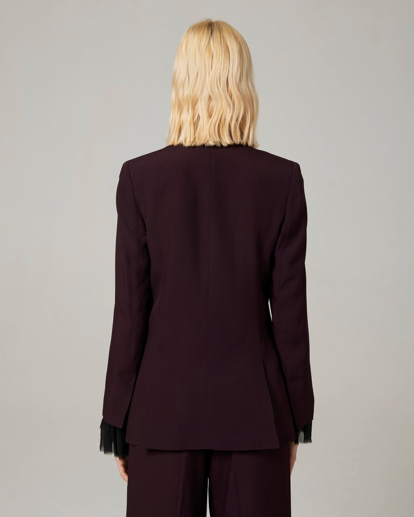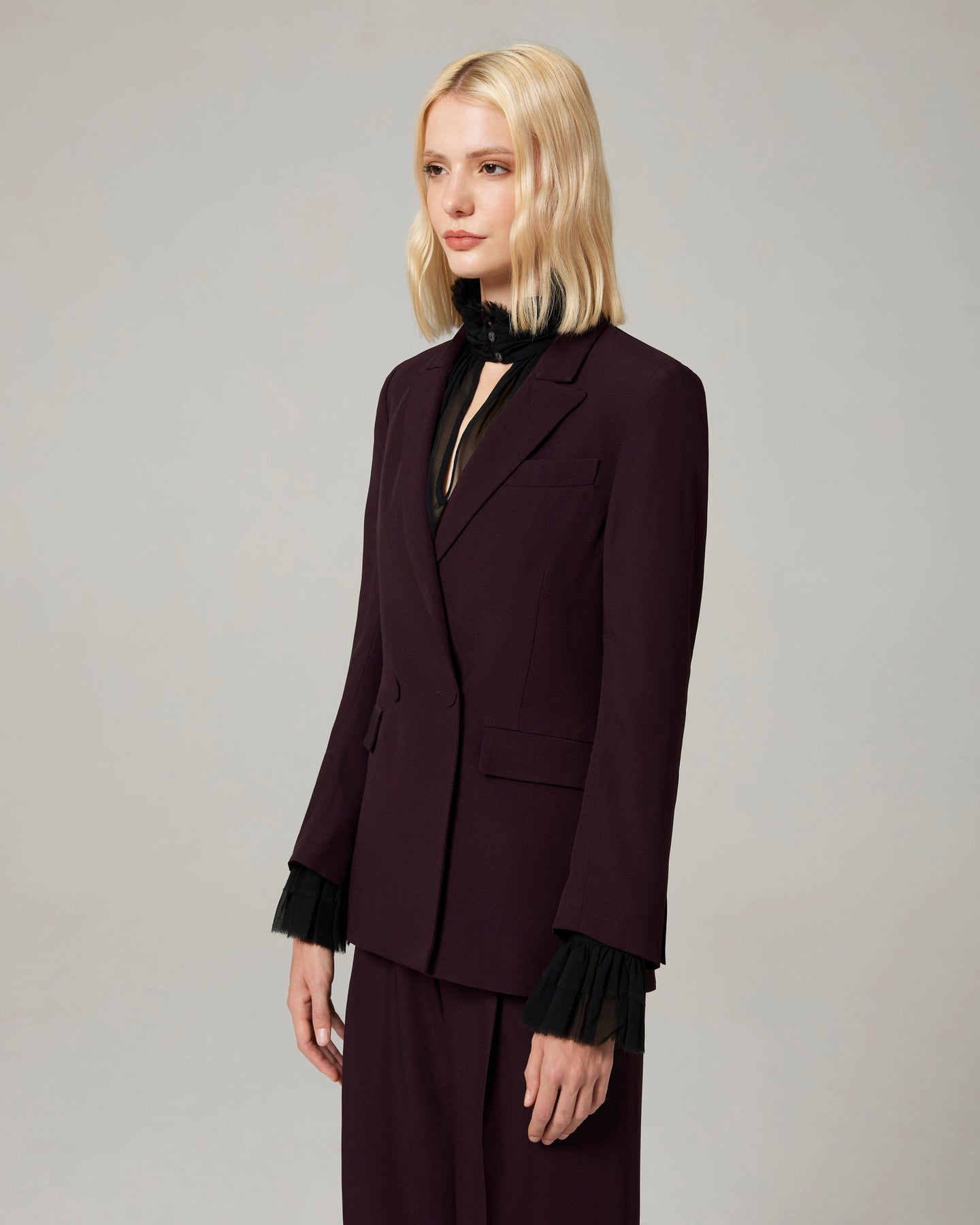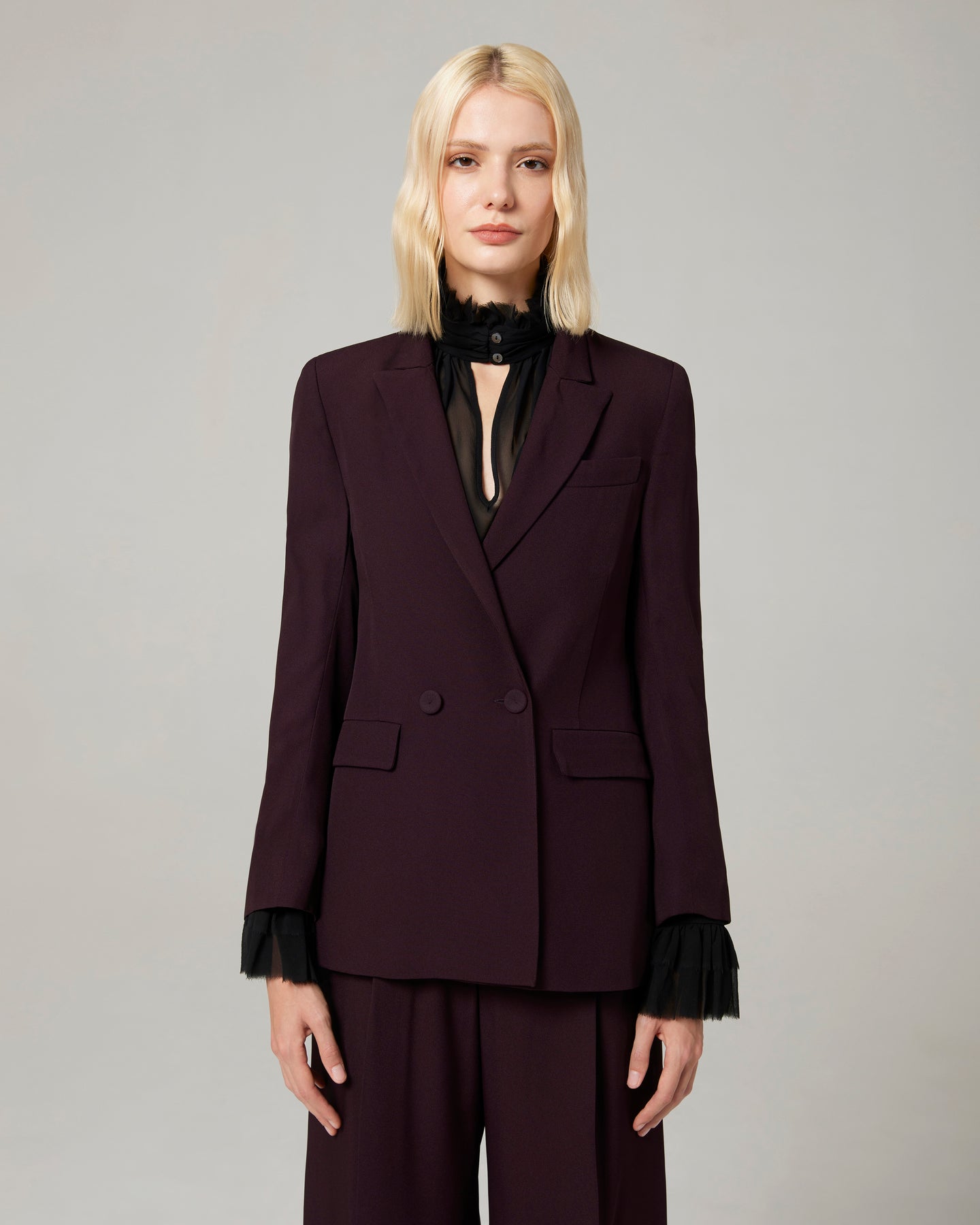 Giacca doppiopetto in morbido cady dalla forma a sacchetto, con lungo e sottile revere che slancia la figura. Spezzatura bassa, bottoni ricoperti. Spacchi sul retro.