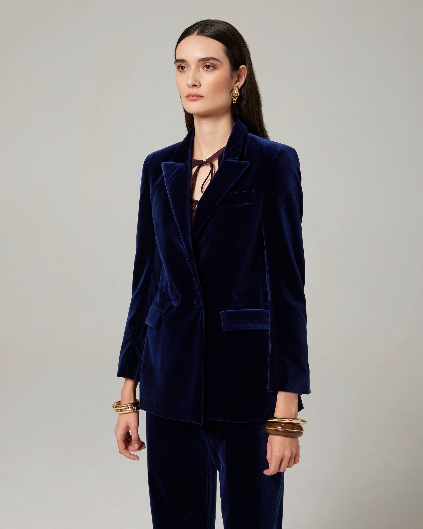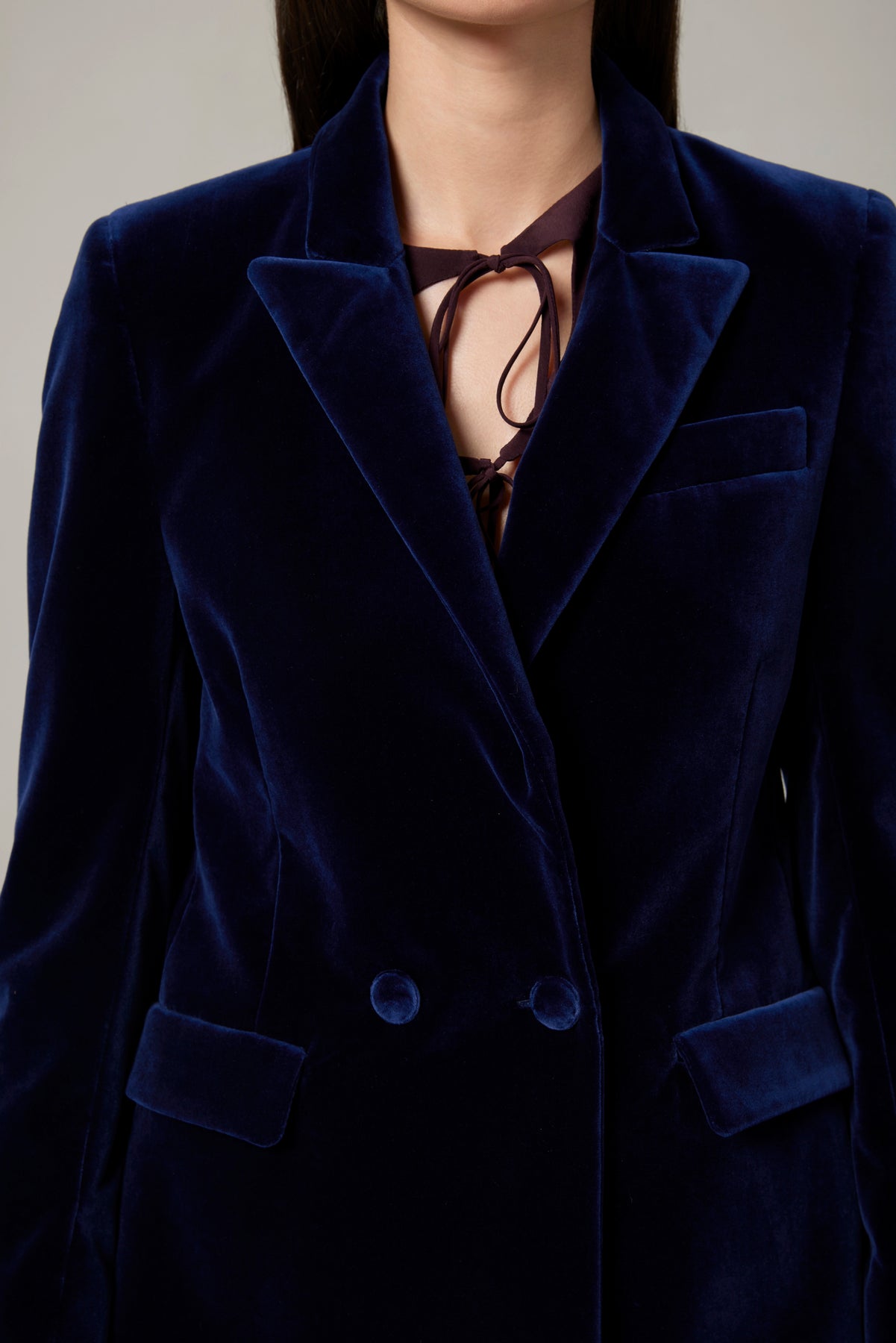 Giacca doppiopetto in velluto di cotone dalla forma a sacchetto, con lungo e sottile revere che slancia la figura. Spezzatura bassa, bottoni ricoperti. Spacchi sul retro.