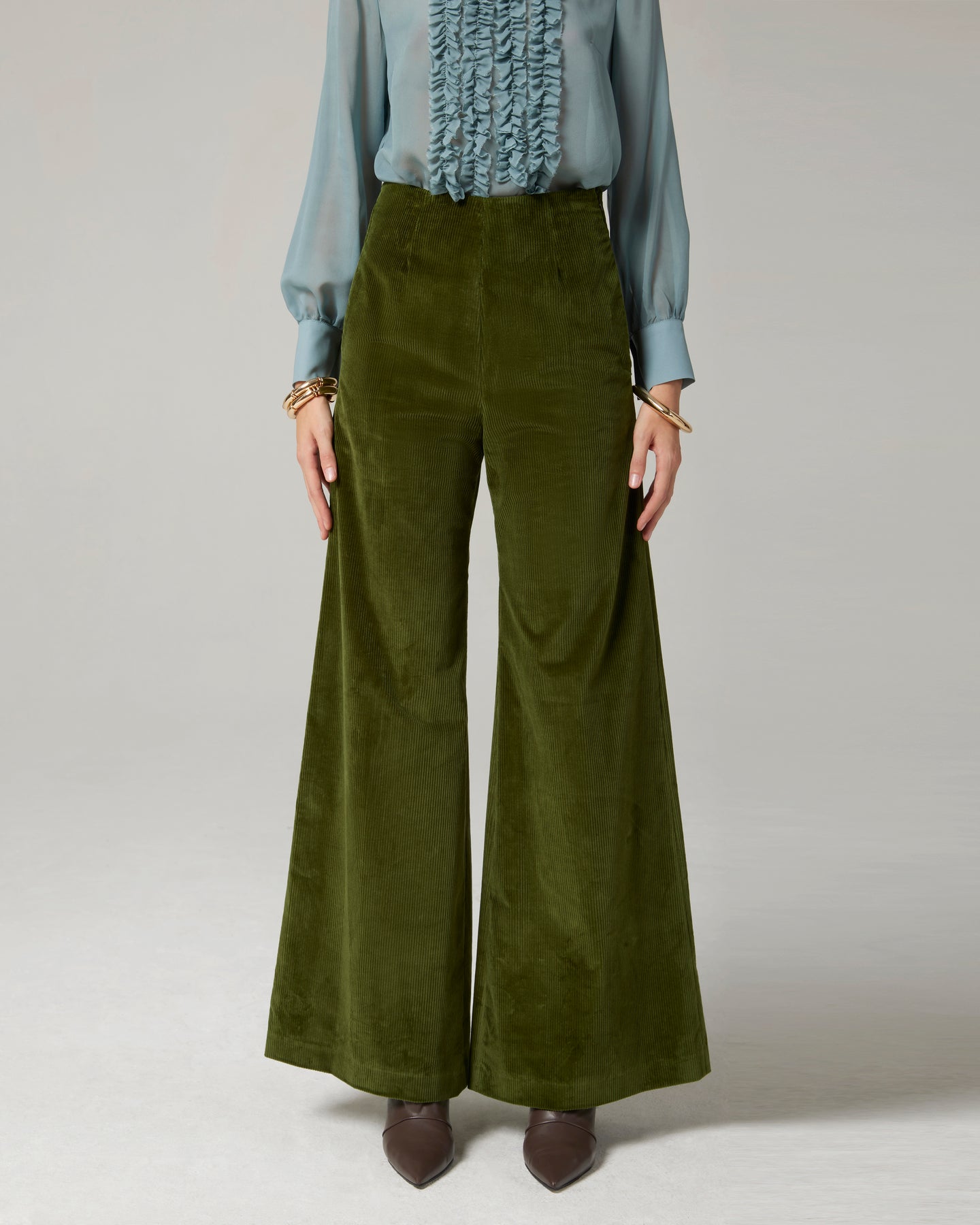 Pantalone a vita alta in velluto a coste dalla vestibilità perfetta, che slancia la figura. Cerniera laterale, tasche a filetto posteriori.