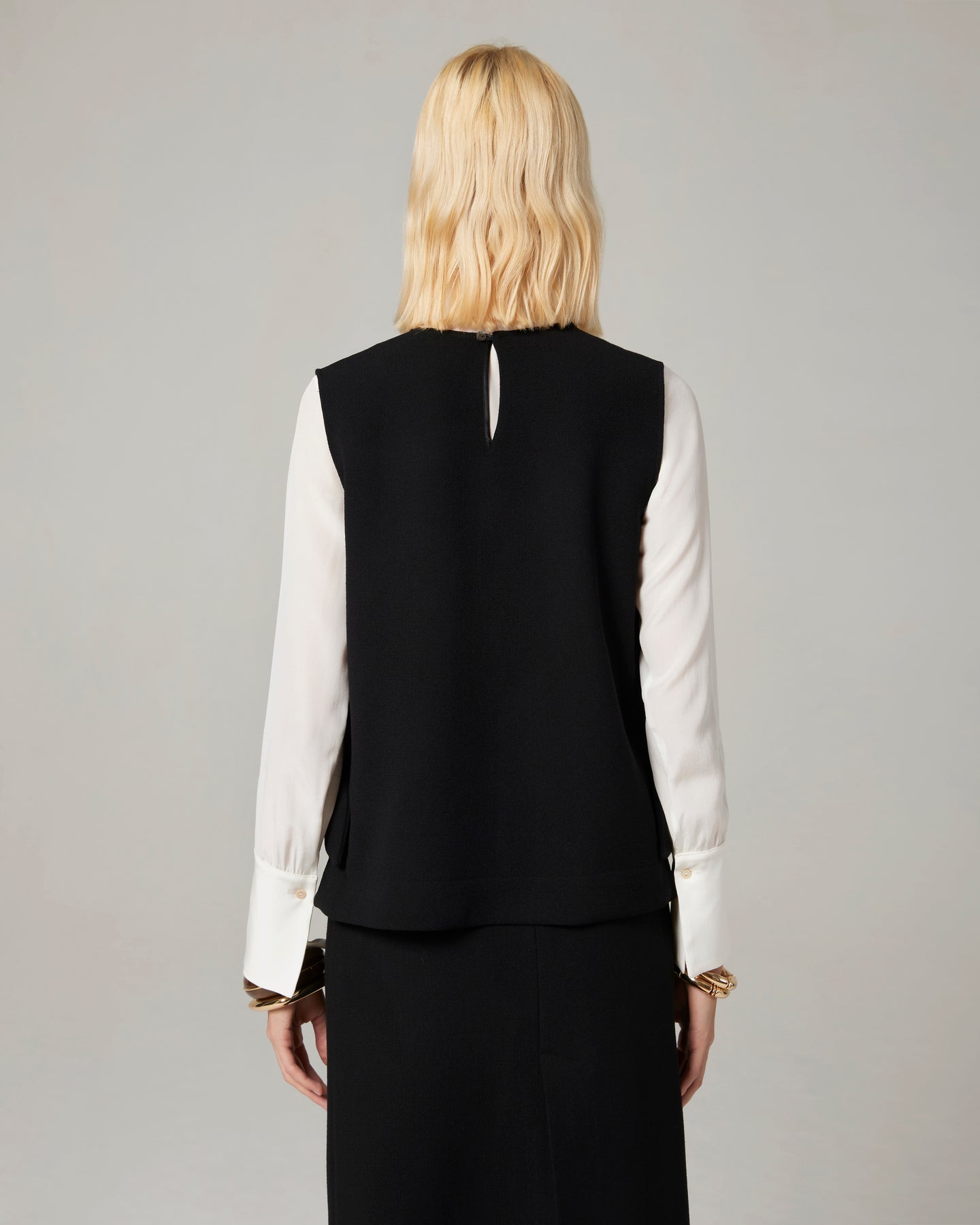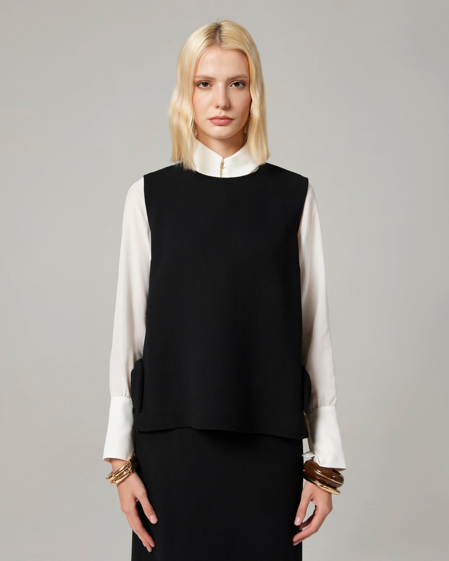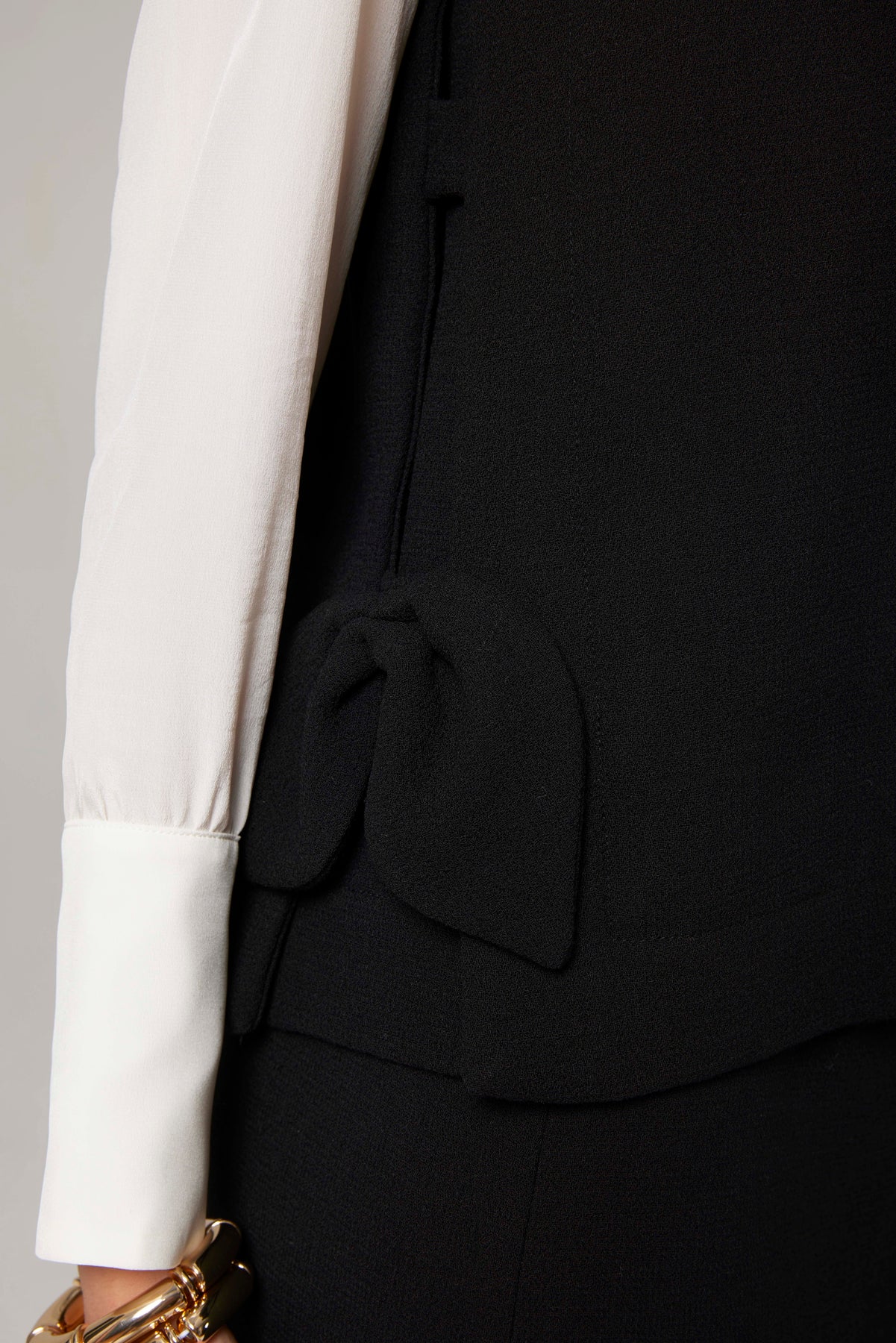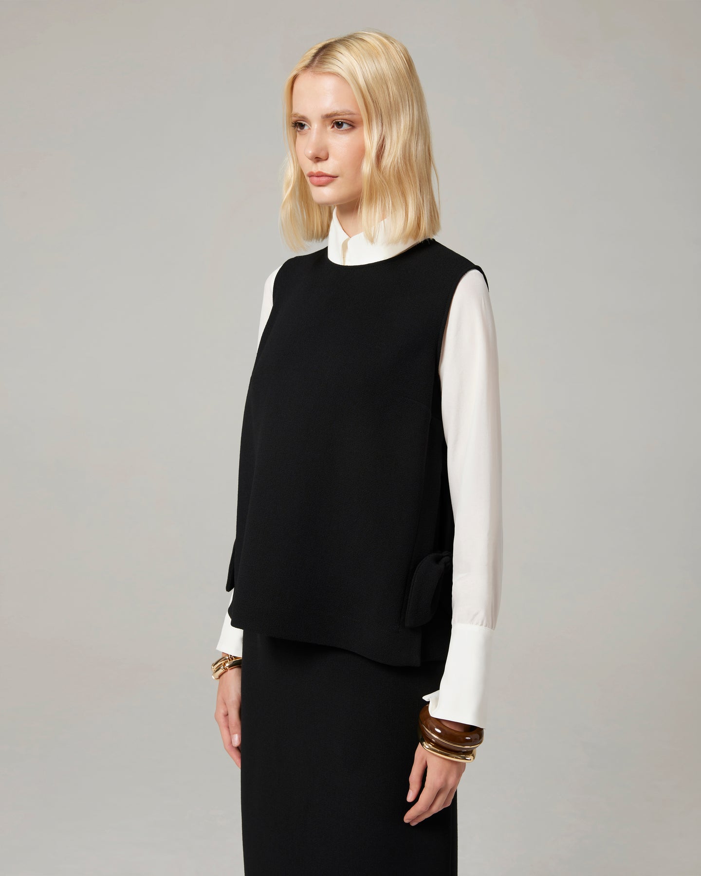 Top in doppio crepe di pura lana dalla linea leggermente svasata con fiocchi applicati lateralmente.