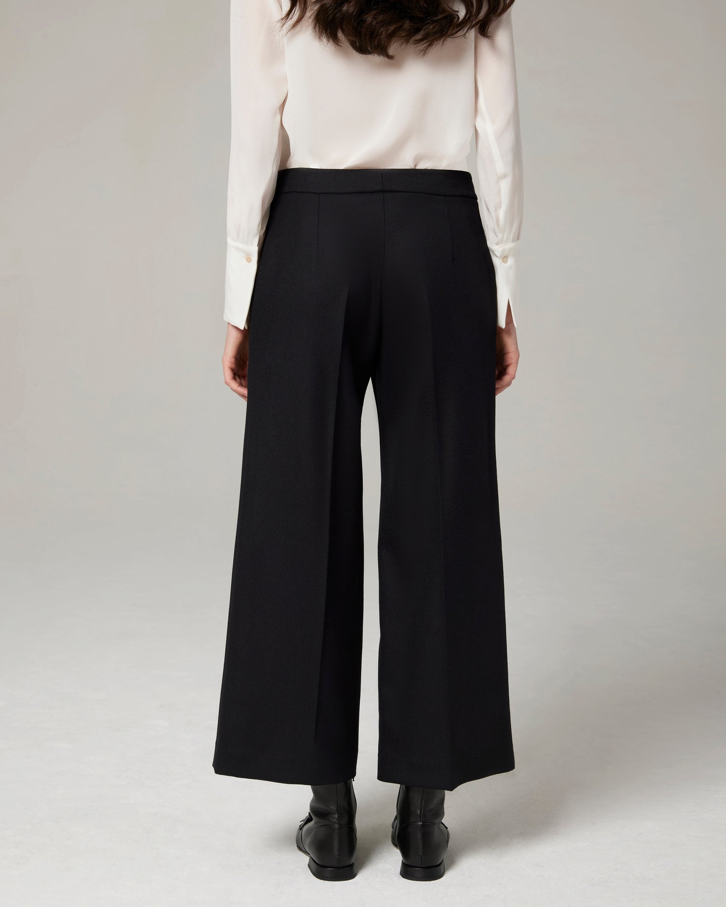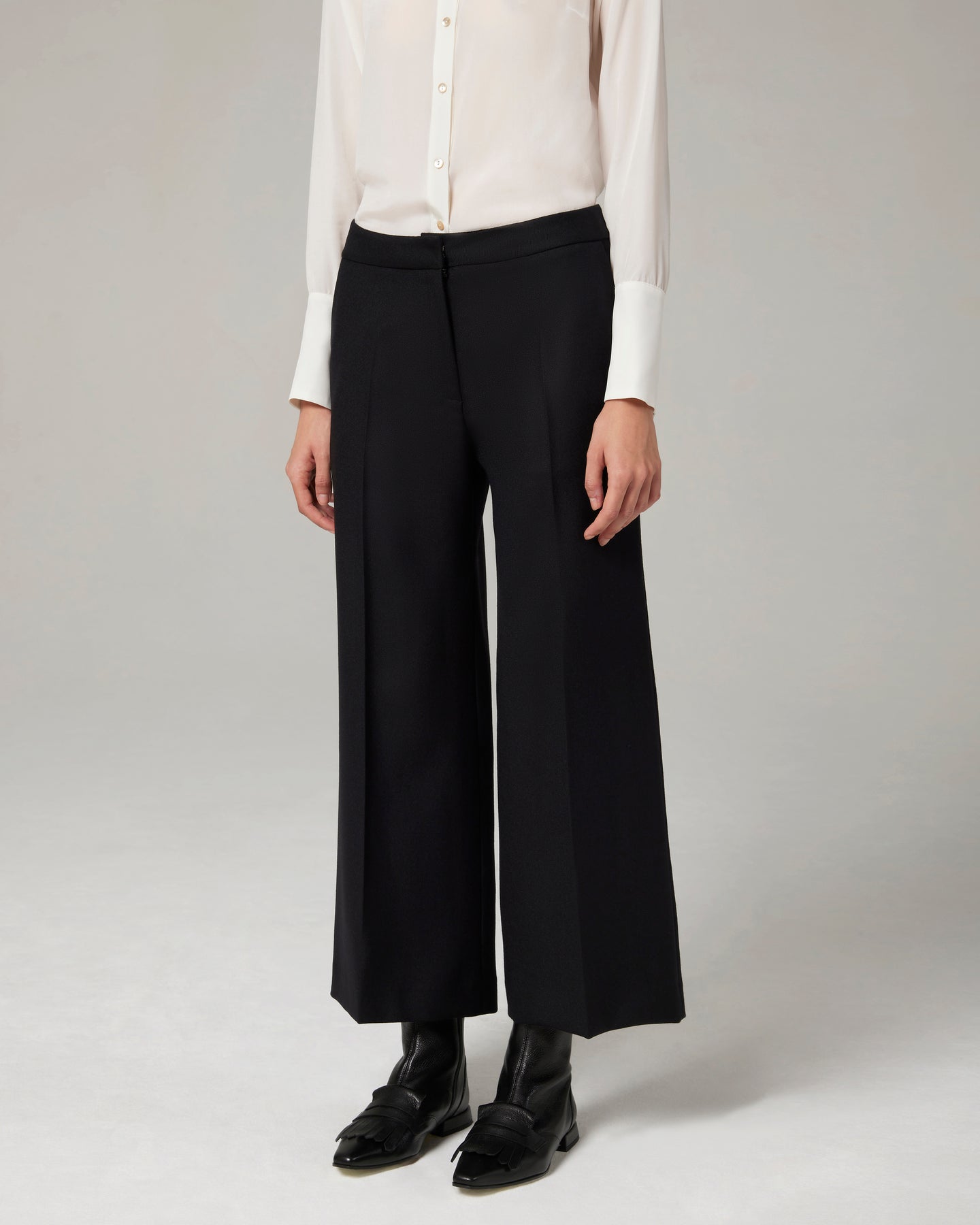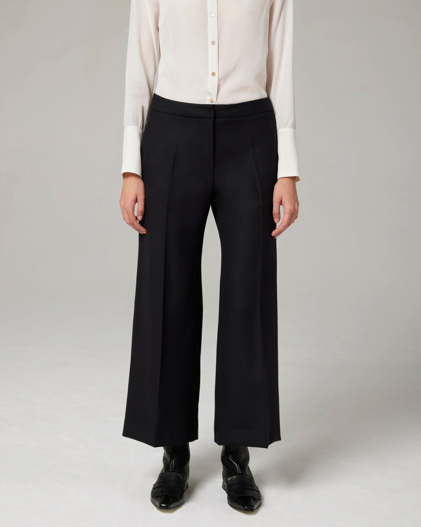 Pantalone di ispirazione maschile e contemporanea, linea dritta, lunghezza alla caviglia. Qui nella versione in panno di lana.