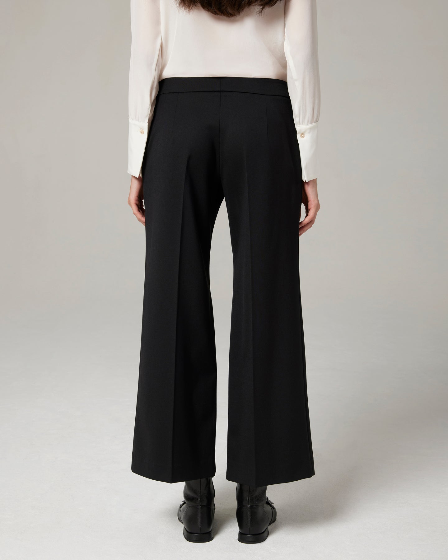 Pantalone di ispirazione maschile e contemporanea, linea dritta, lunghezza alla caviglia. Qui nella versione in saglia di lana elasticizzata.