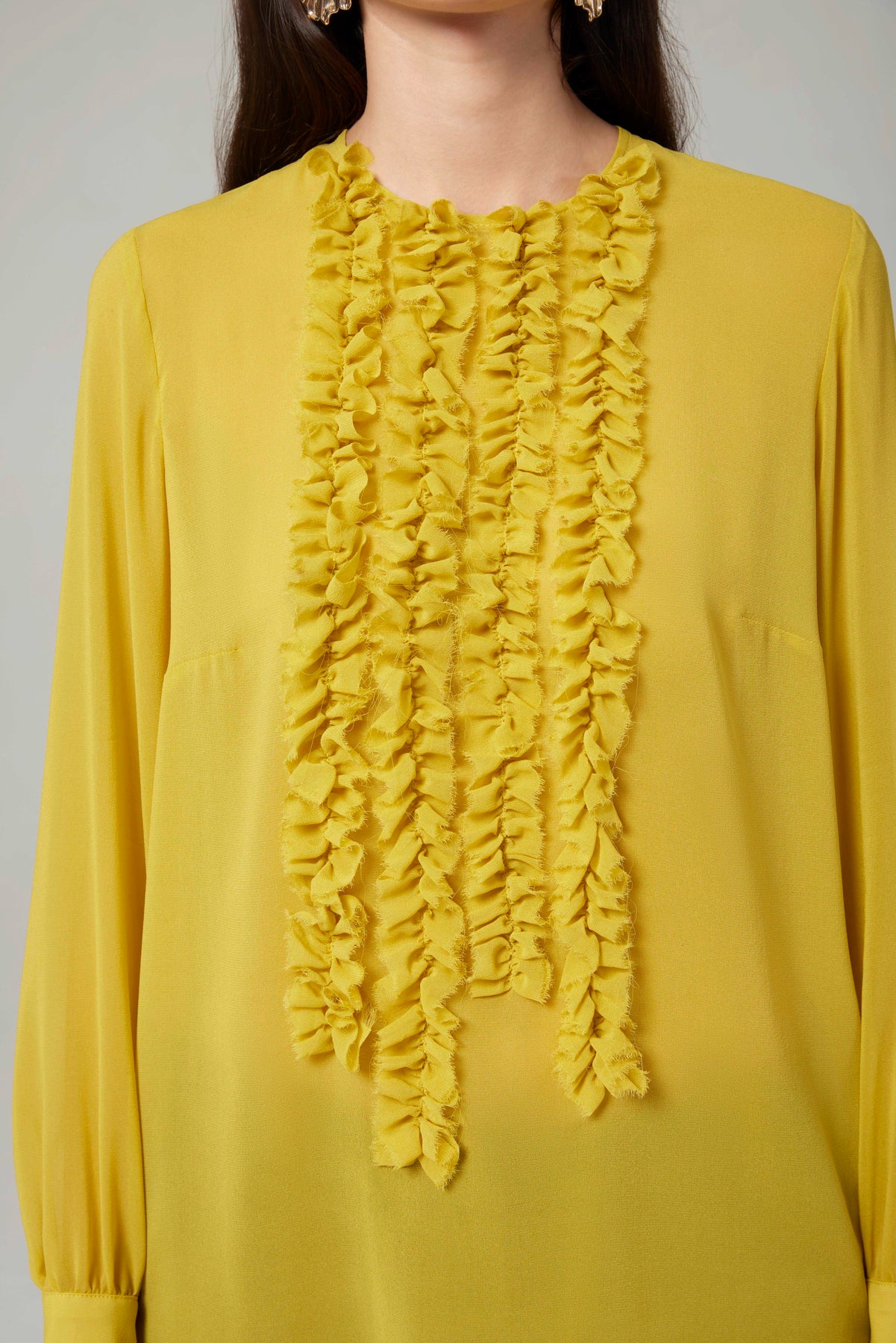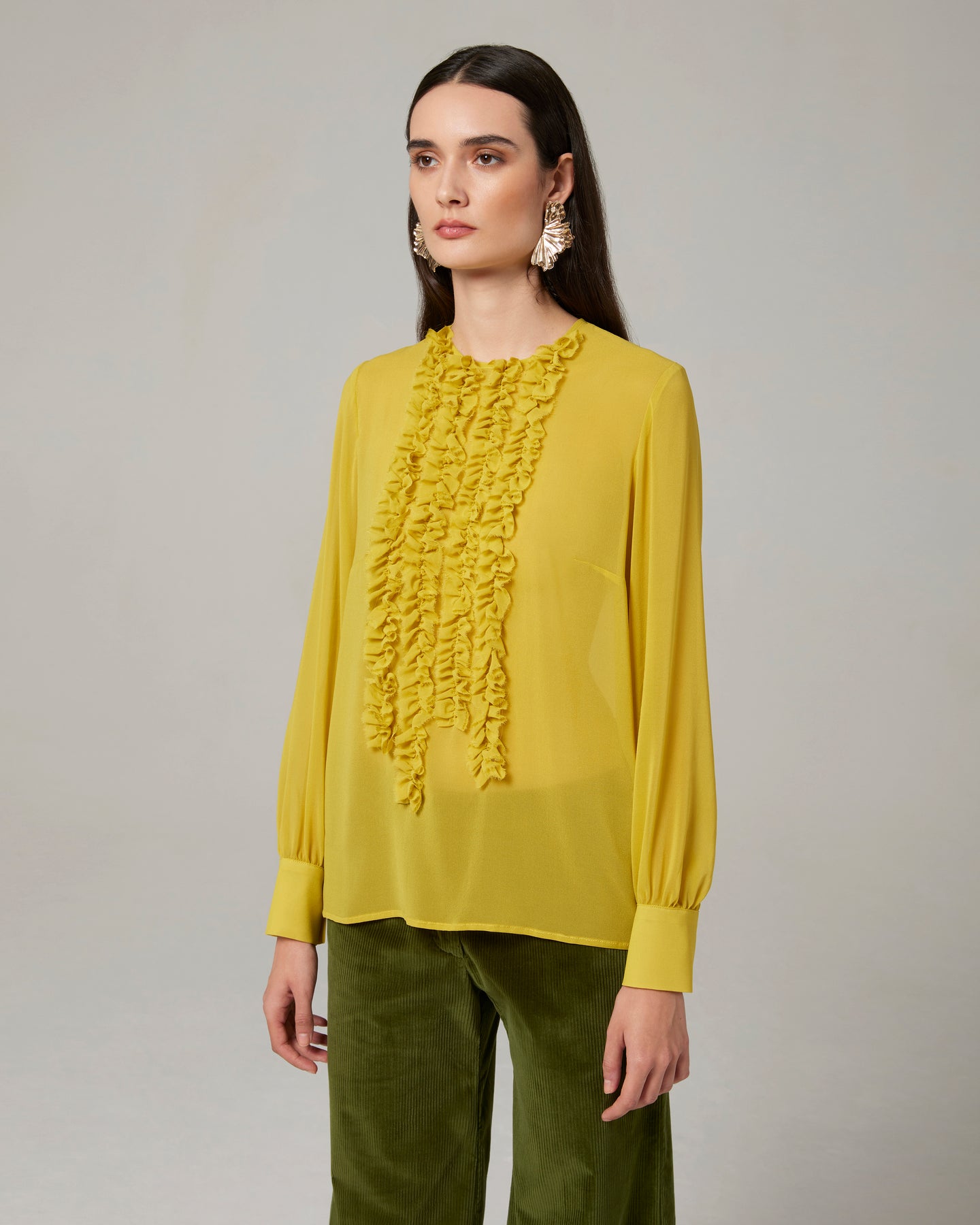 Blusa girocollo in georgette di pura seta con delicate rouches sul davanti.