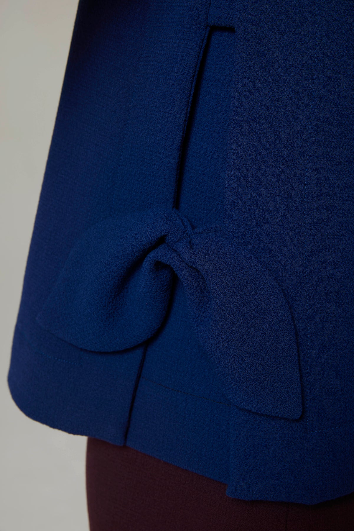 Top in doppio crepe di pura lana dalla linea leggermente svasata con fiocchi applicati lateralmente.